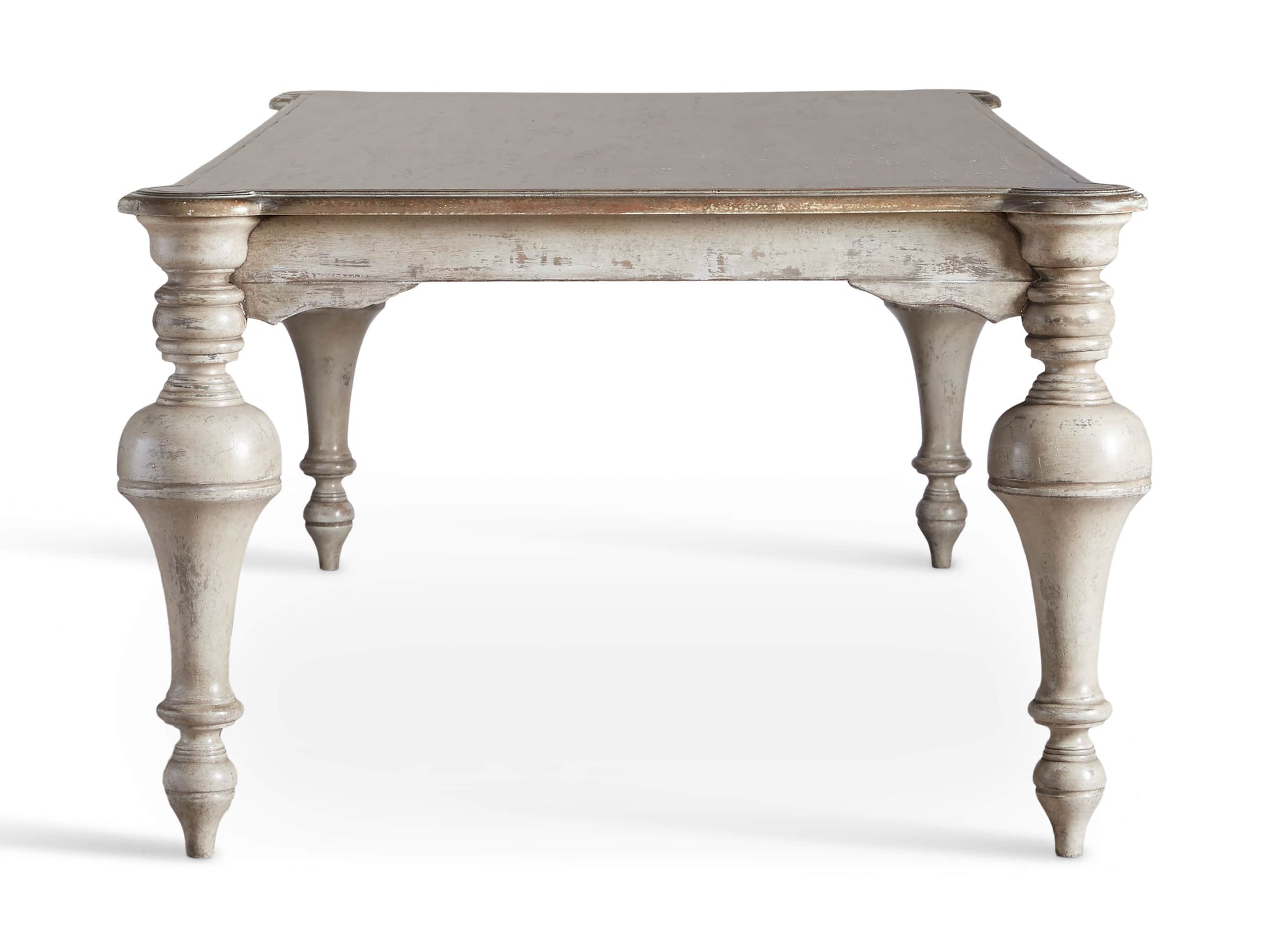 - Antique Antico finishes are hand-painted with scrolling details—layered ivory, grey, and beige tones create an elegant, timeless aesthetic. Table bases feature a contrasting, dark grey finish.
