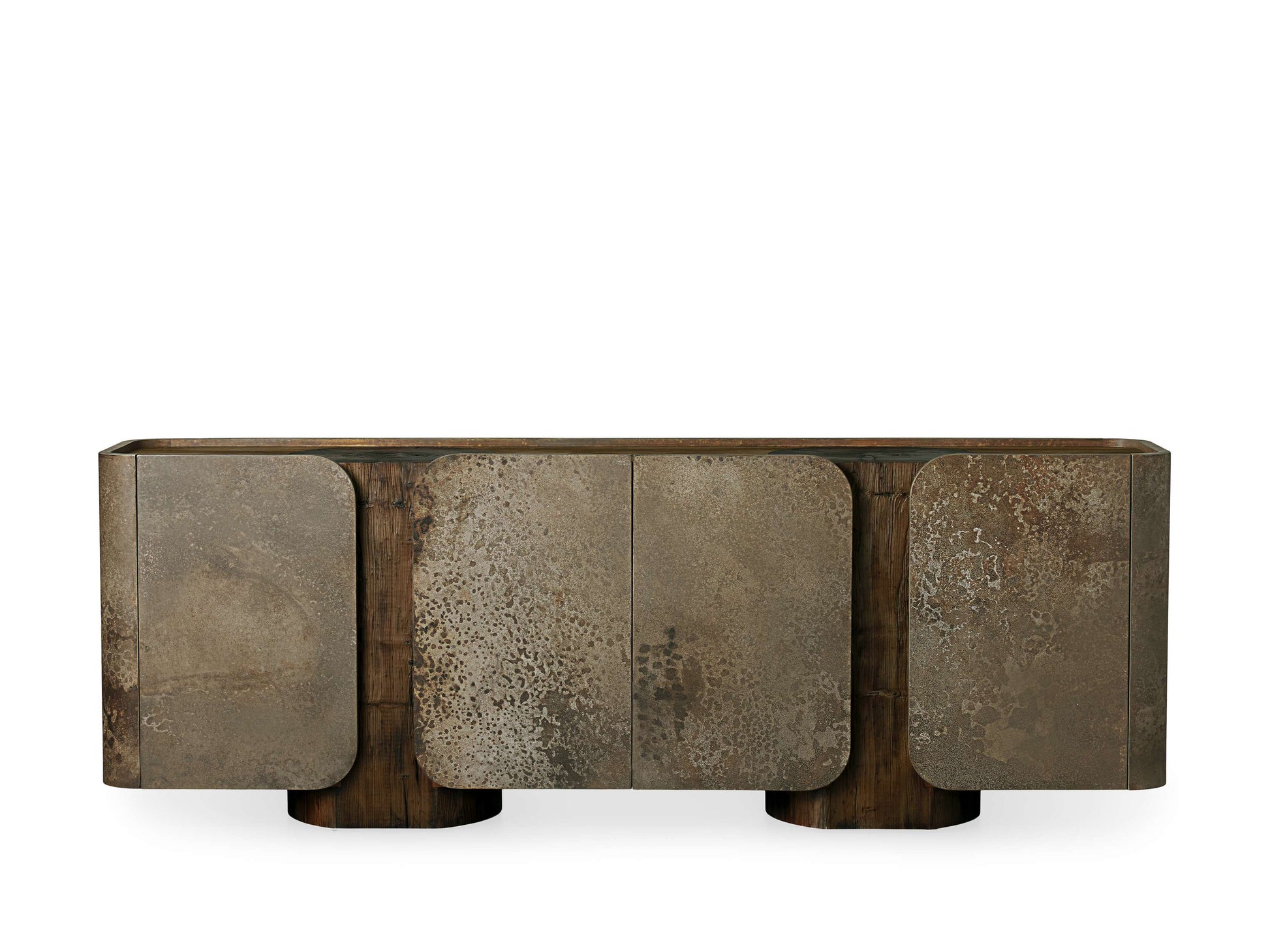 Capturing the graining and tonality of salvaged alder wood, our imaginative artisan partners in Mexico juxtapose wood with weathered aluminum to create our Alvaro Collection. Each sideboard rests on alder wood stumps, preserving their rustic beauty and creating an eye-catching tabletop design. Wrapping around with gently curved edges are welded panels of weathered aluminum, each left out in the elements to develop their unique patina. Keep everyday essentials close with the ample interior storage space, from dinnerware in the dining room to board games in the living room—Alvaro is a gorgeous addition to any space in your home.