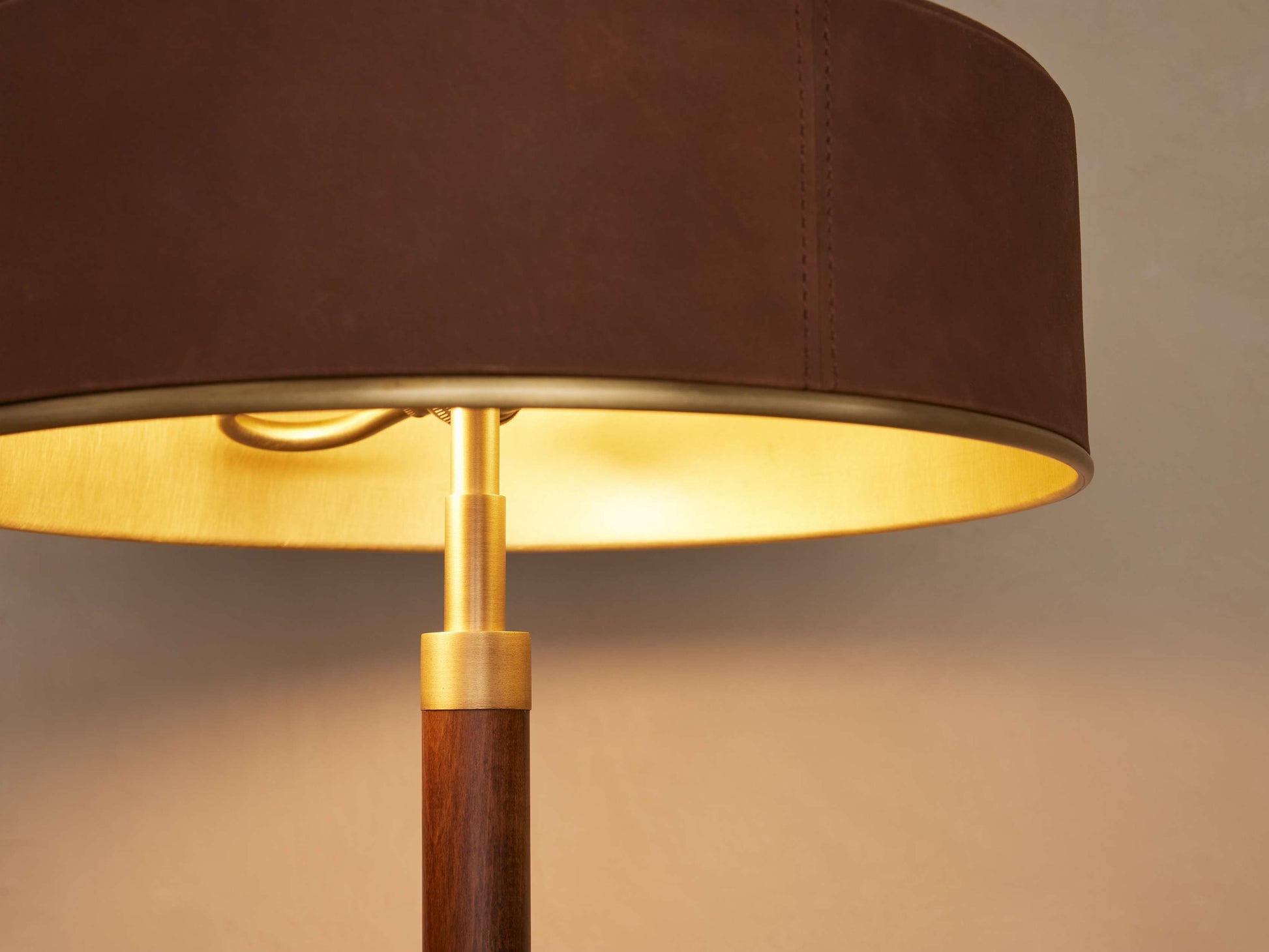- Crafted from beech wood and brass accents with a nubuck leather shade.