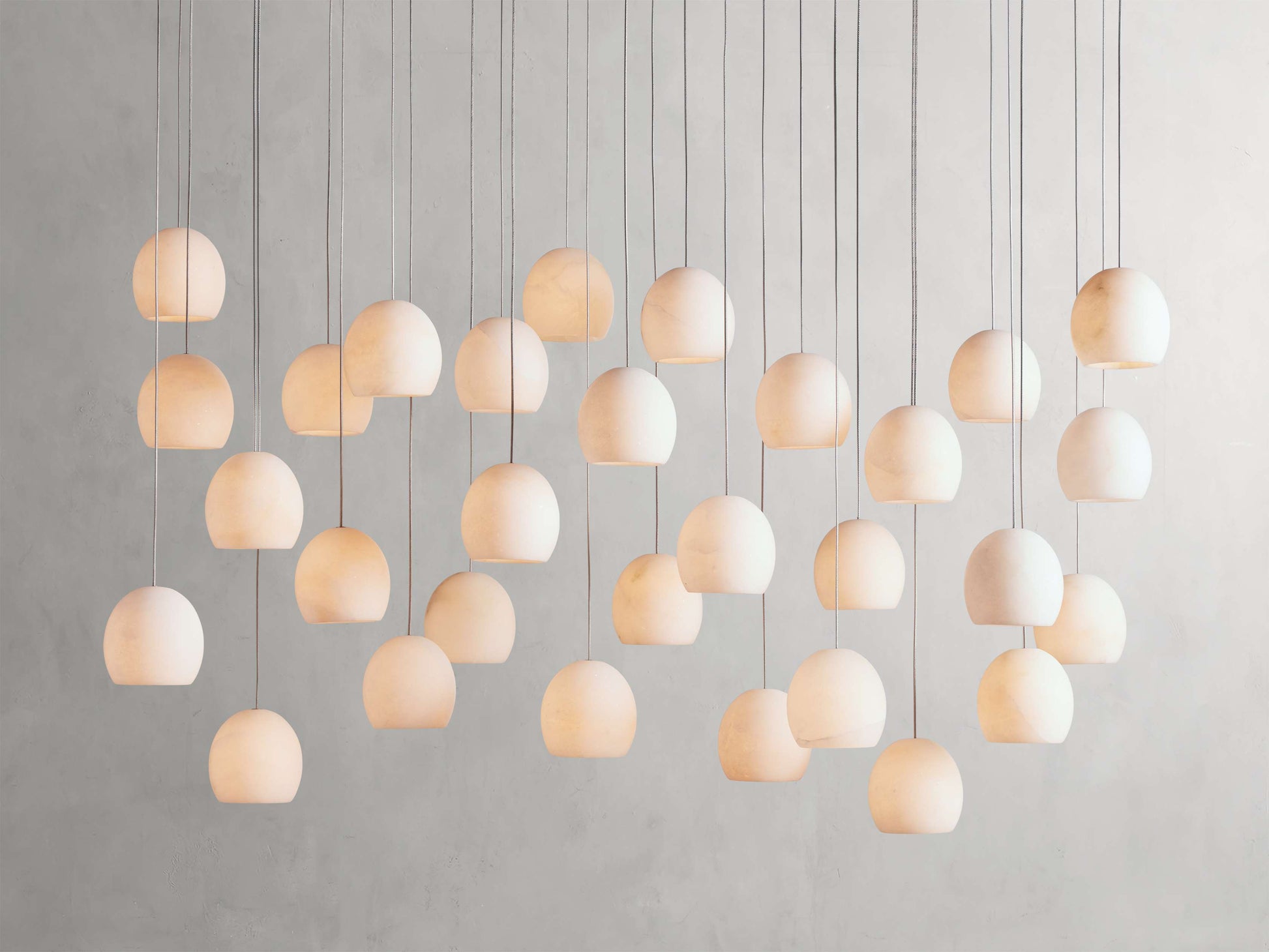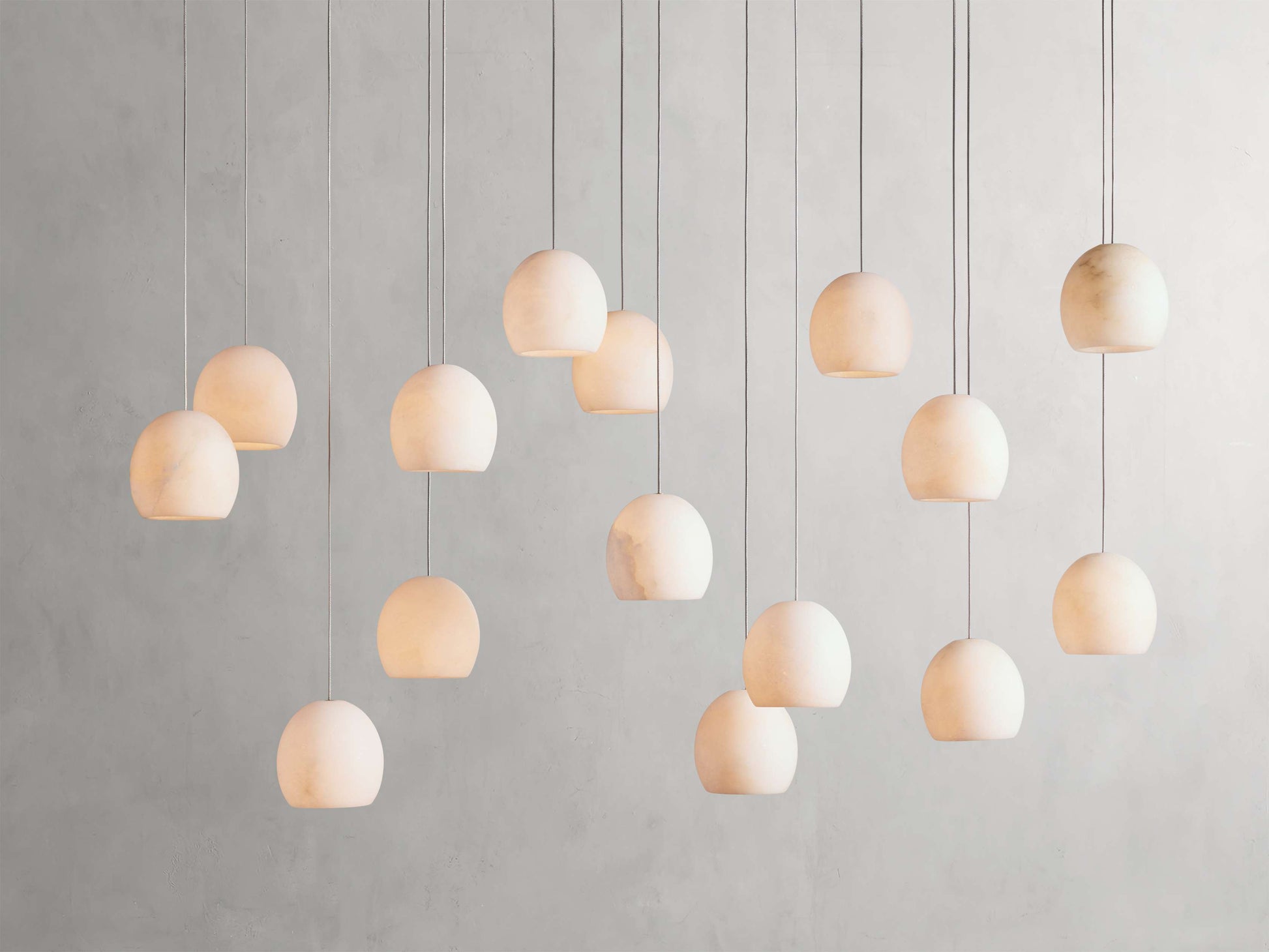 - Exposed airplane cable is complemented by a curved shade crafted from natural alabaster stone.