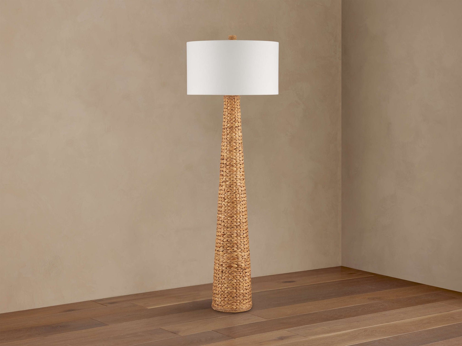 - Crafted from hand-woven water hyacinth accented with a linen shade.