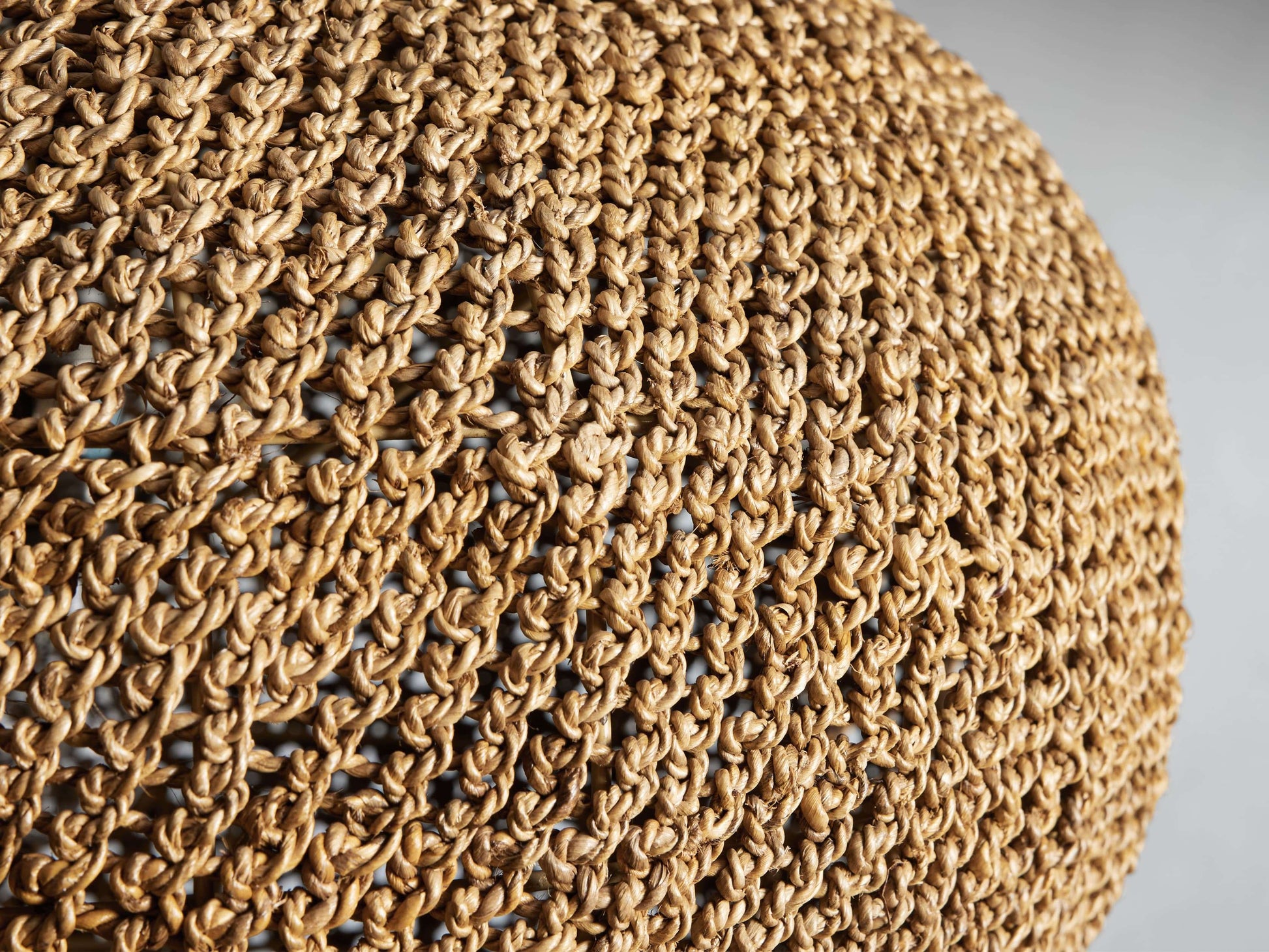 - Crafted from handwoven natural banana rope wrapped around a metal frame with a plated brass canopy.