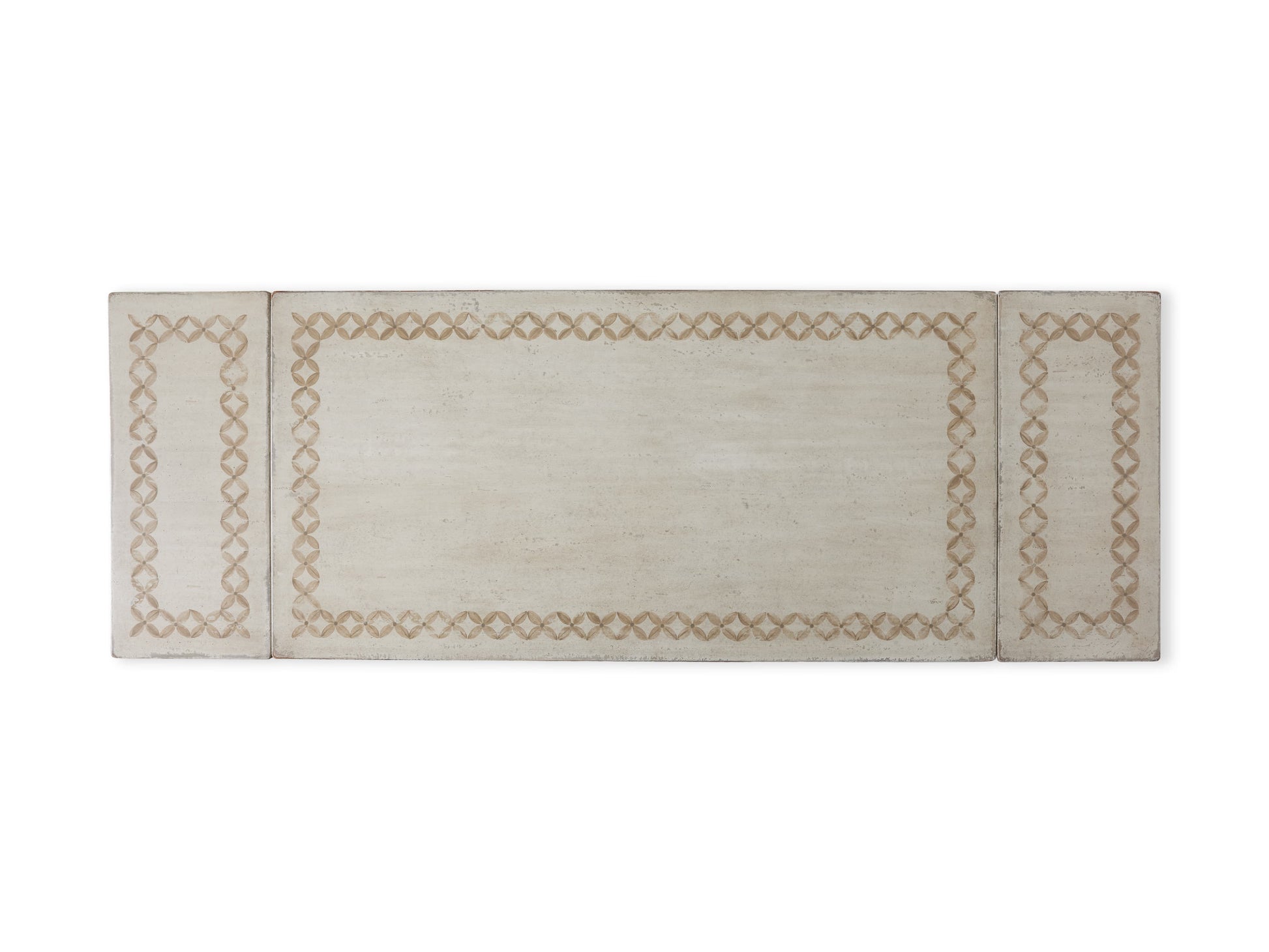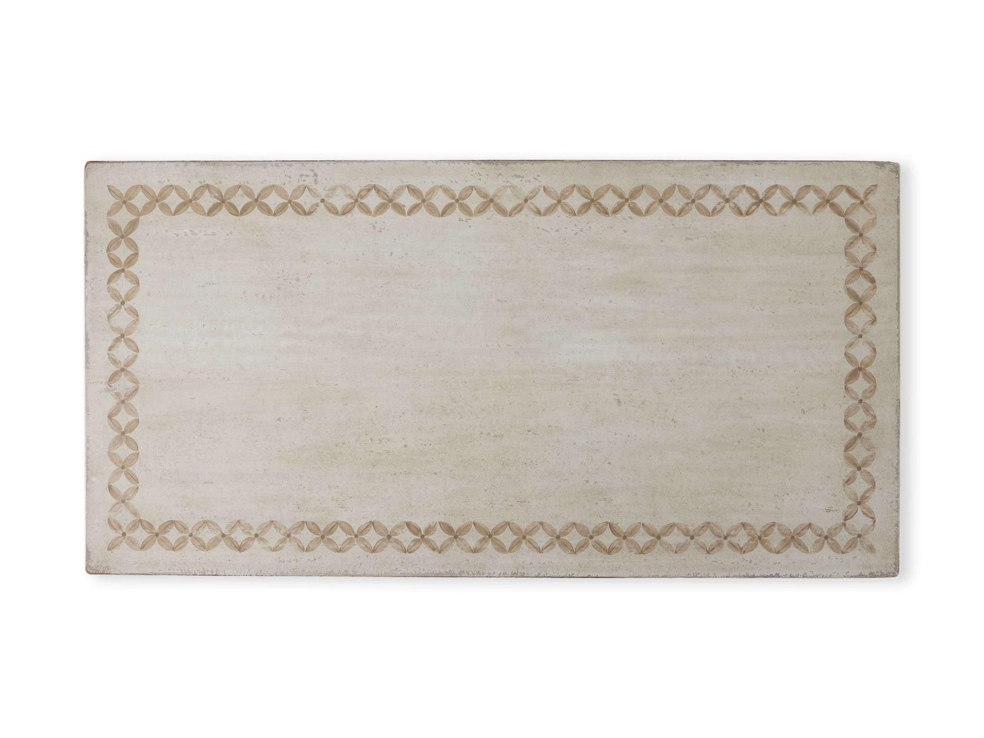- A hand-painted diamond border adds subtle detail to this tabletop.