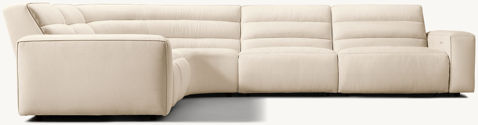 - This configuration includes 1 left-arm reclining chair, 2 armless reclining chairs, 1 corner stationary wedge and 1 right-arm reclining chair