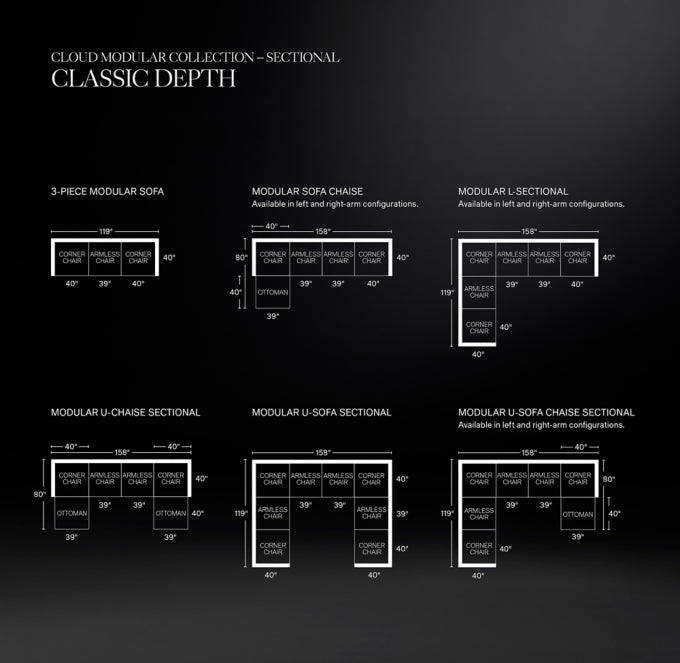 - Cushion configuration may vary by component. Refer to the detailed dimensions.