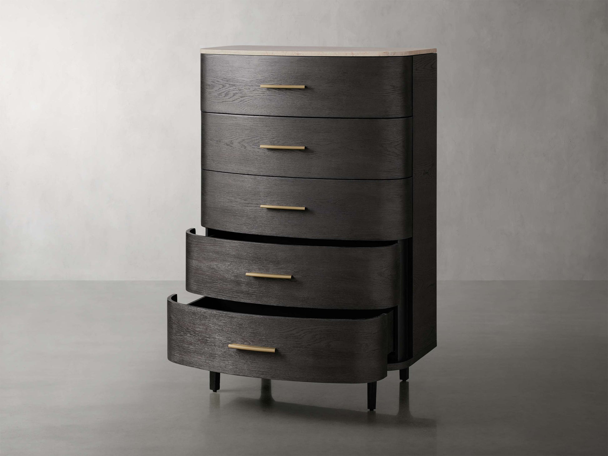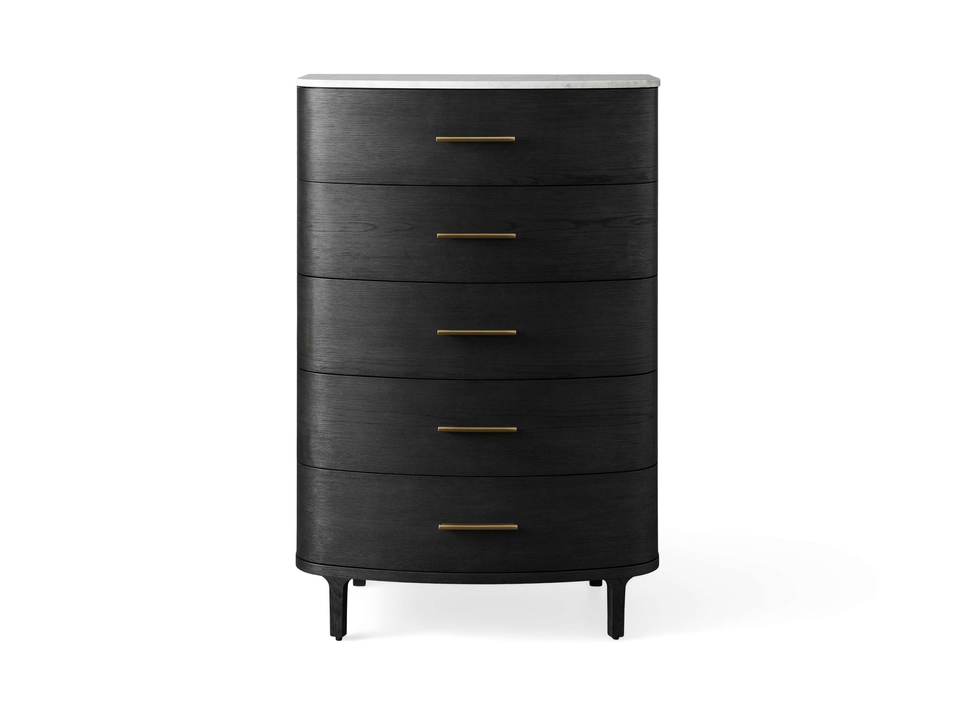 Elevate your bedroom oasis with our Danny Bedroom Collection. Crafted from oak wood in a beautiful ebony finish, Danny’s gently curved silhouettes elevate your space with marble tops and contrasting brass pulls.