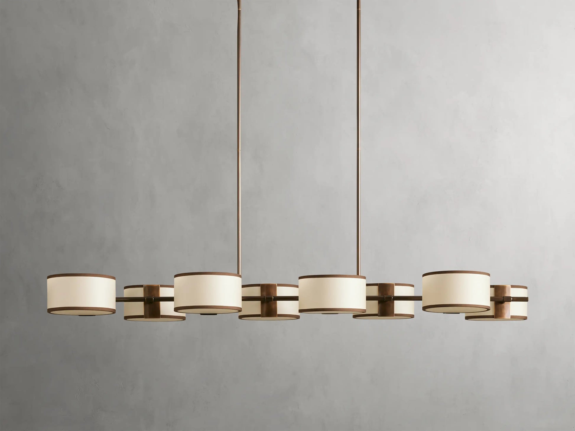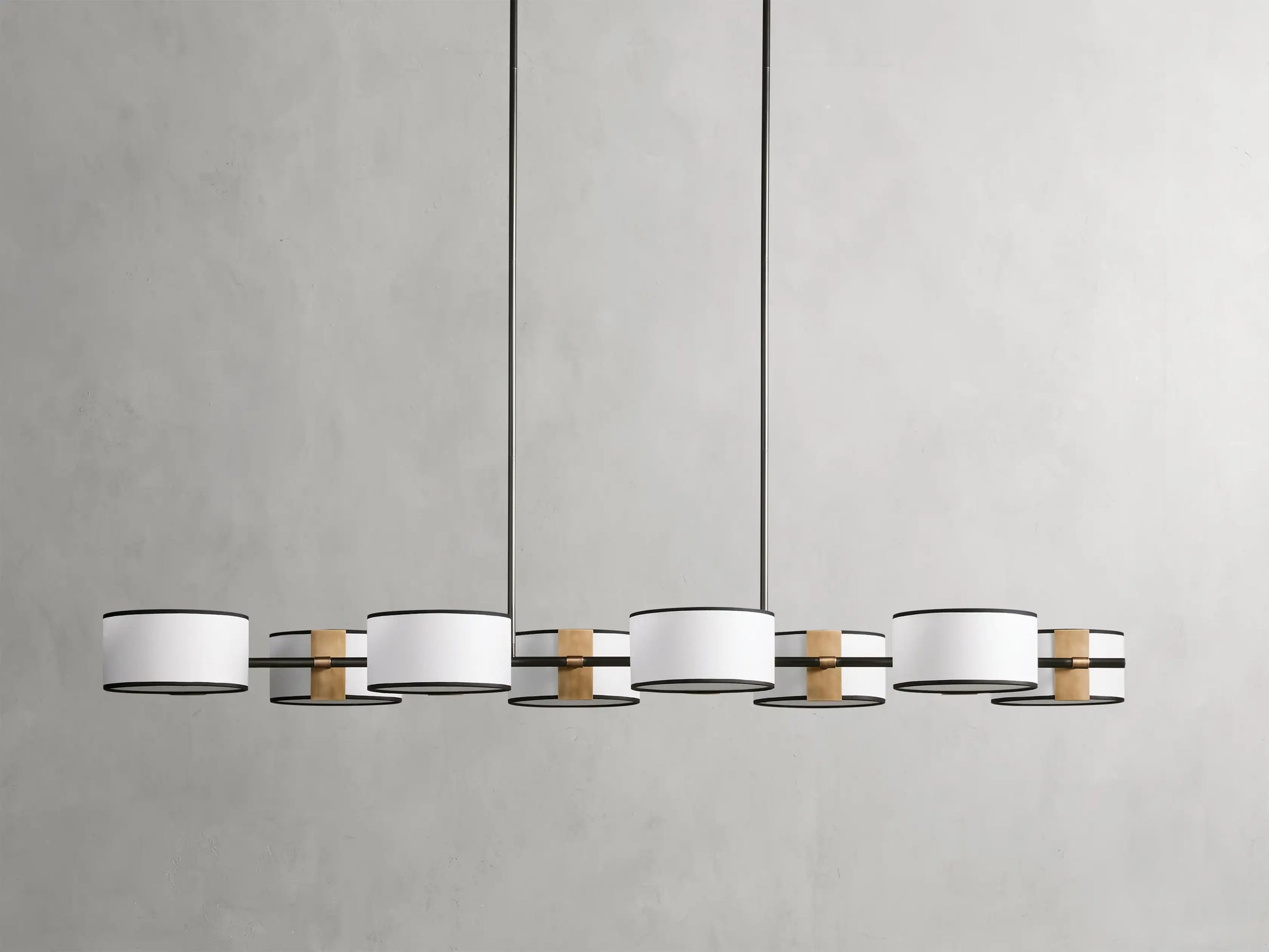 - Bronze fixtures include a white linen shade with black trim; light bronze fixtures include a cream parchment shade with brown trim.
