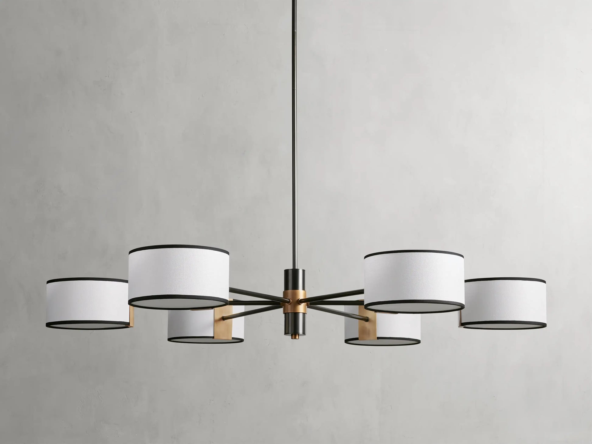 - Bronze fixtures include a white linen shade with black trim; light bronze fixtures include a cream parchment shade with brown trim.
