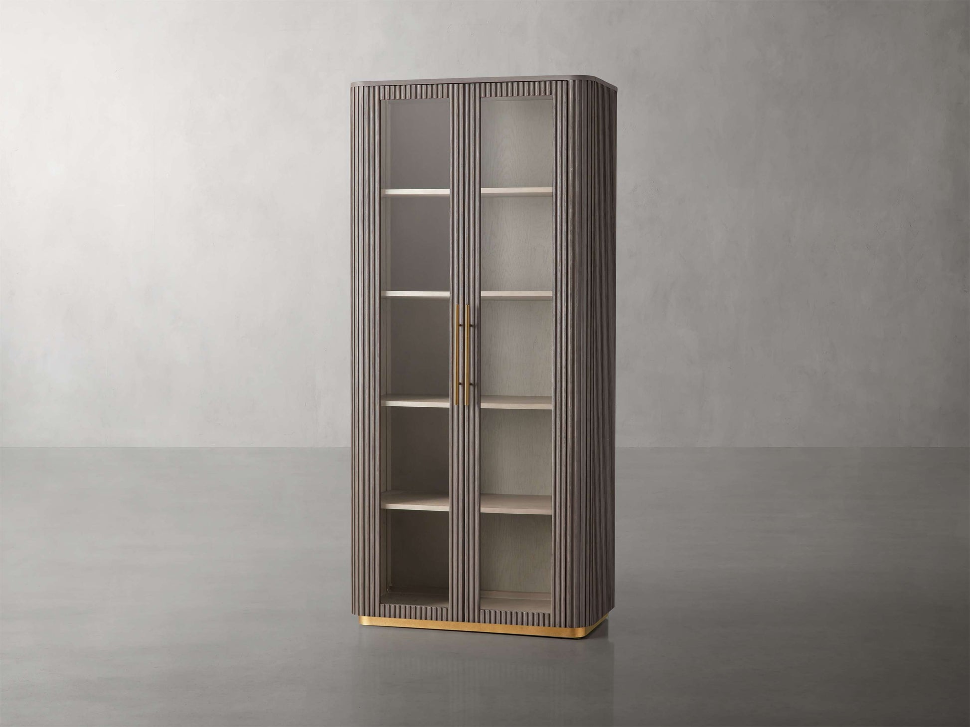 - Cabinet doors are crafted from tempered glass and are complemented by brass pulls.