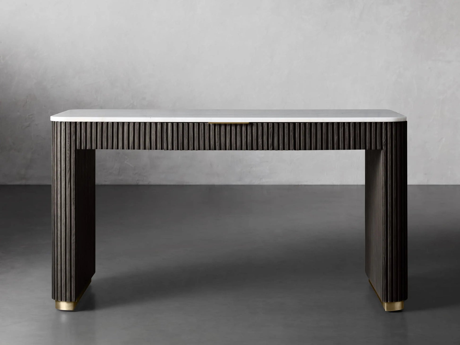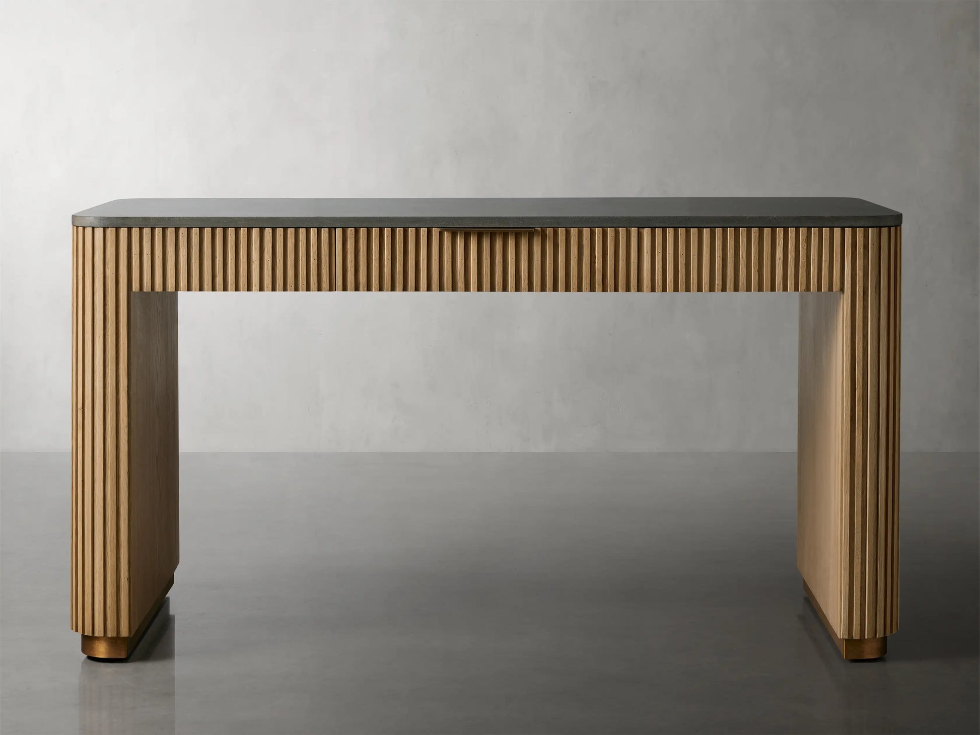 - Hand-stained finishes on reeded wood surfaces include a protective lacquer coating for subtle sheen.