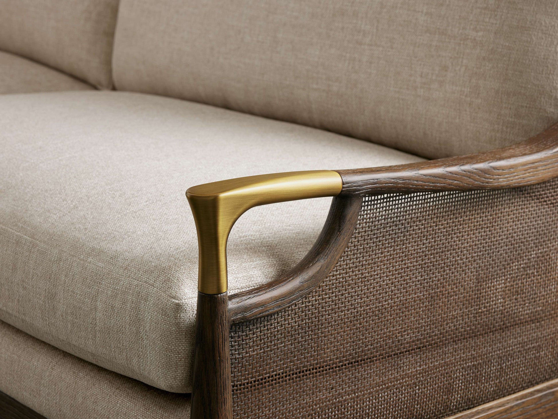 Craftsman-built by artisans in Cambodia, our Fisher Chair’s uniquely shaped silhouette offers stunning graining detail paired with brass accents on its tapered arms and legs. Meticulously crafted to imitate a vintage aesthetic, Fisher’s woven cane frame creates a visual interest perfect for open-seating arrangements.