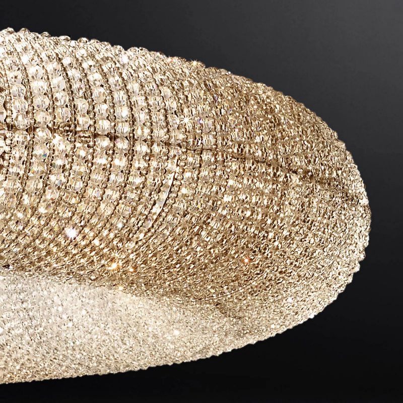 The collection of chandeliers/wall sconce, inspired by French antique designs, features thousands of faceted, hand-wrapped smoked glass beads encasing a steel frame, forming a floating sphere suspended by steel cables. The beads filter and refract light, casting a soft, inviting glow.