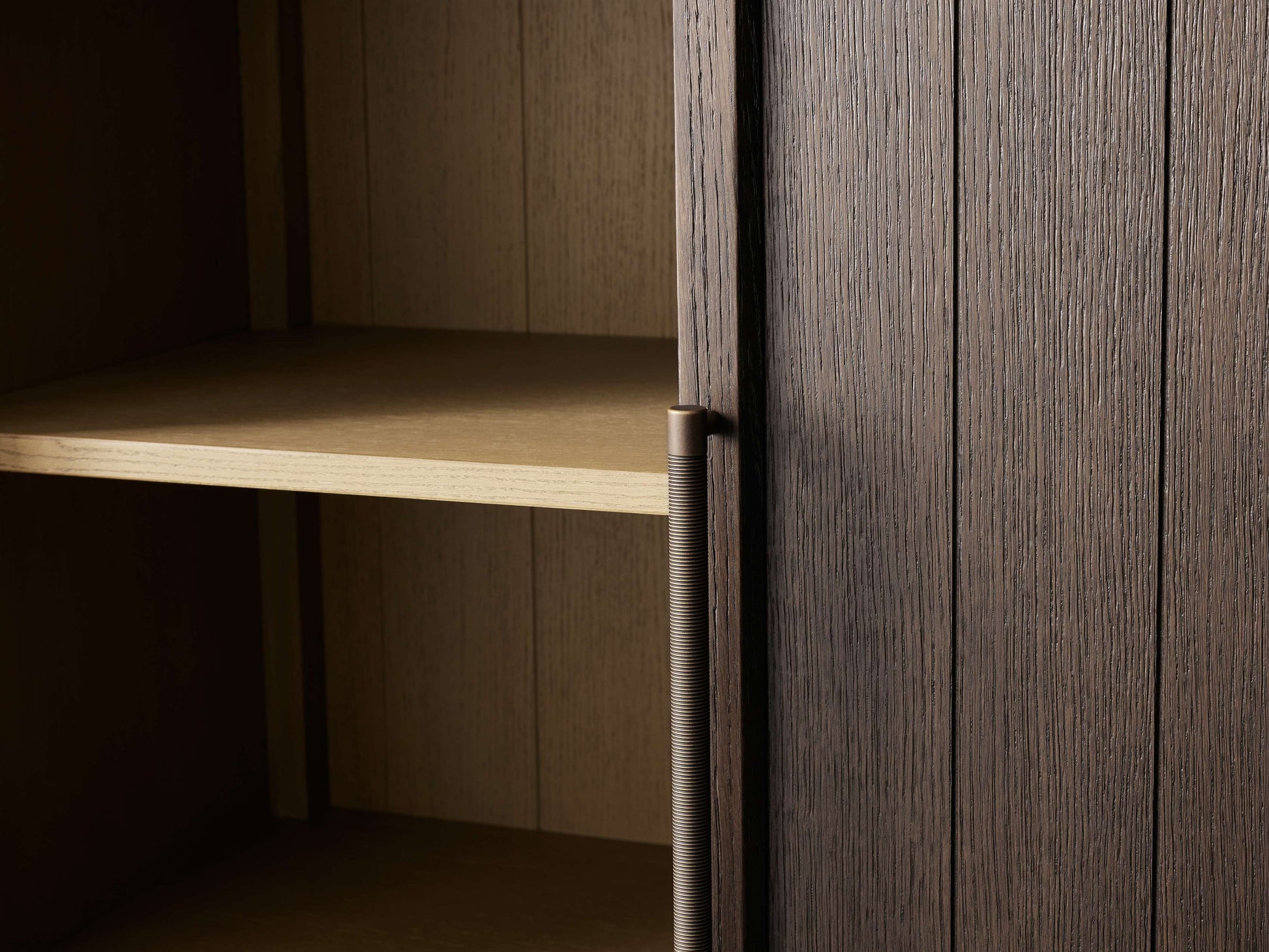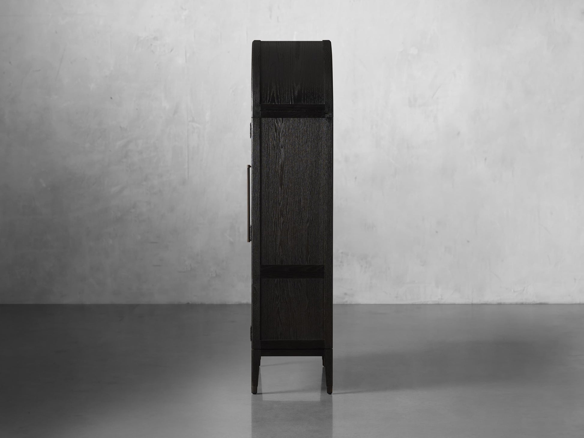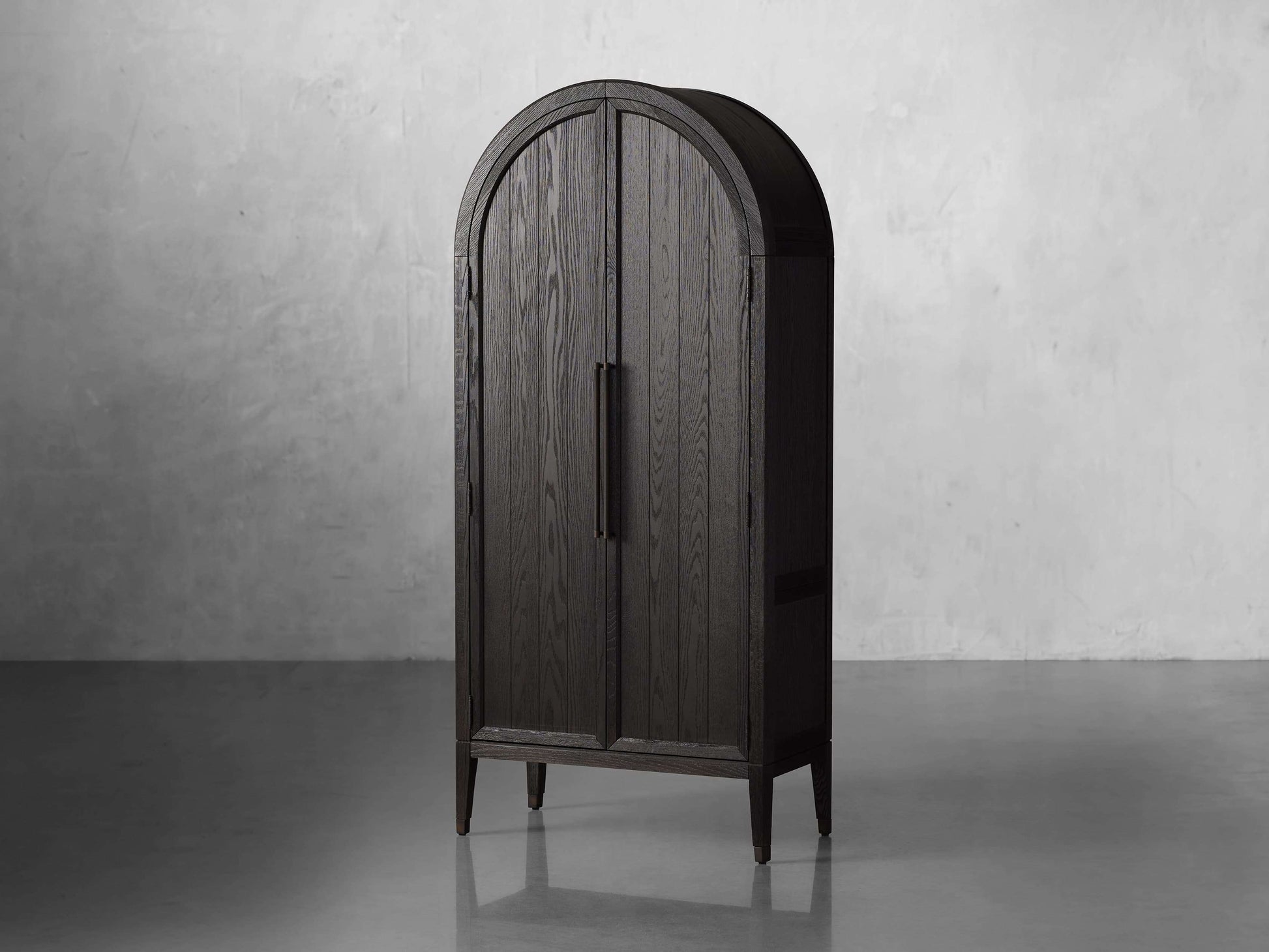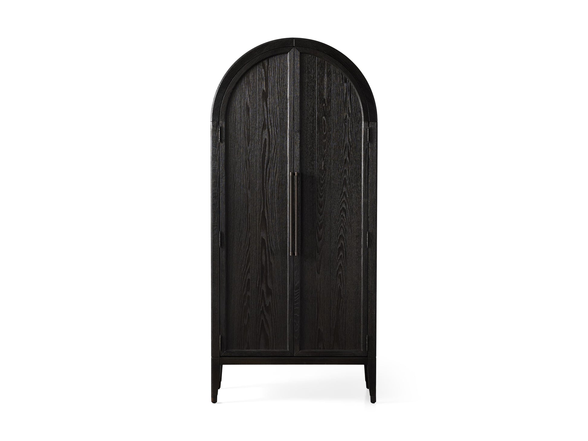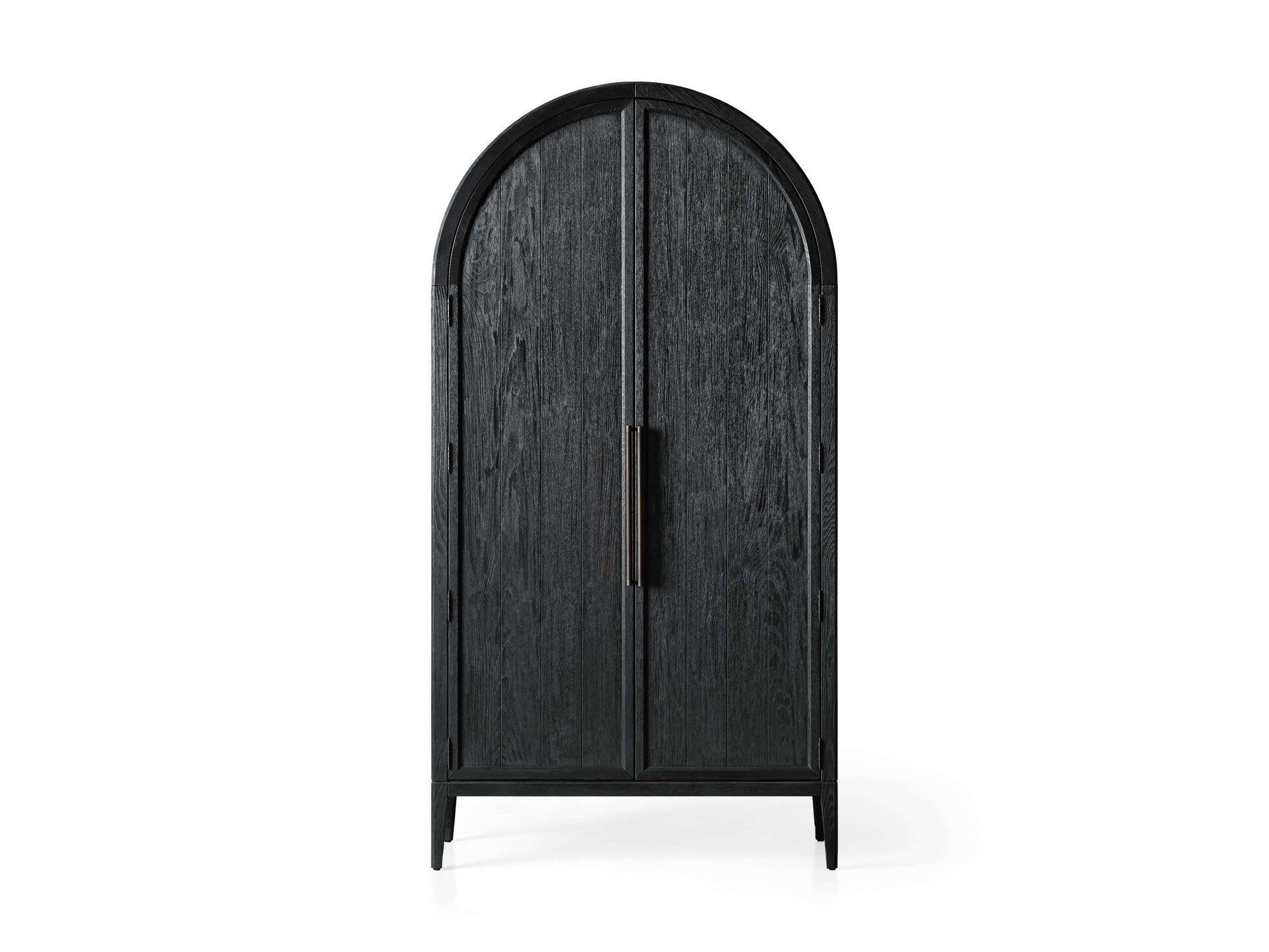 - Cabinet doors feature exposed hinges and reeded hardware—antiqued for a subtle, time-worn appearance.