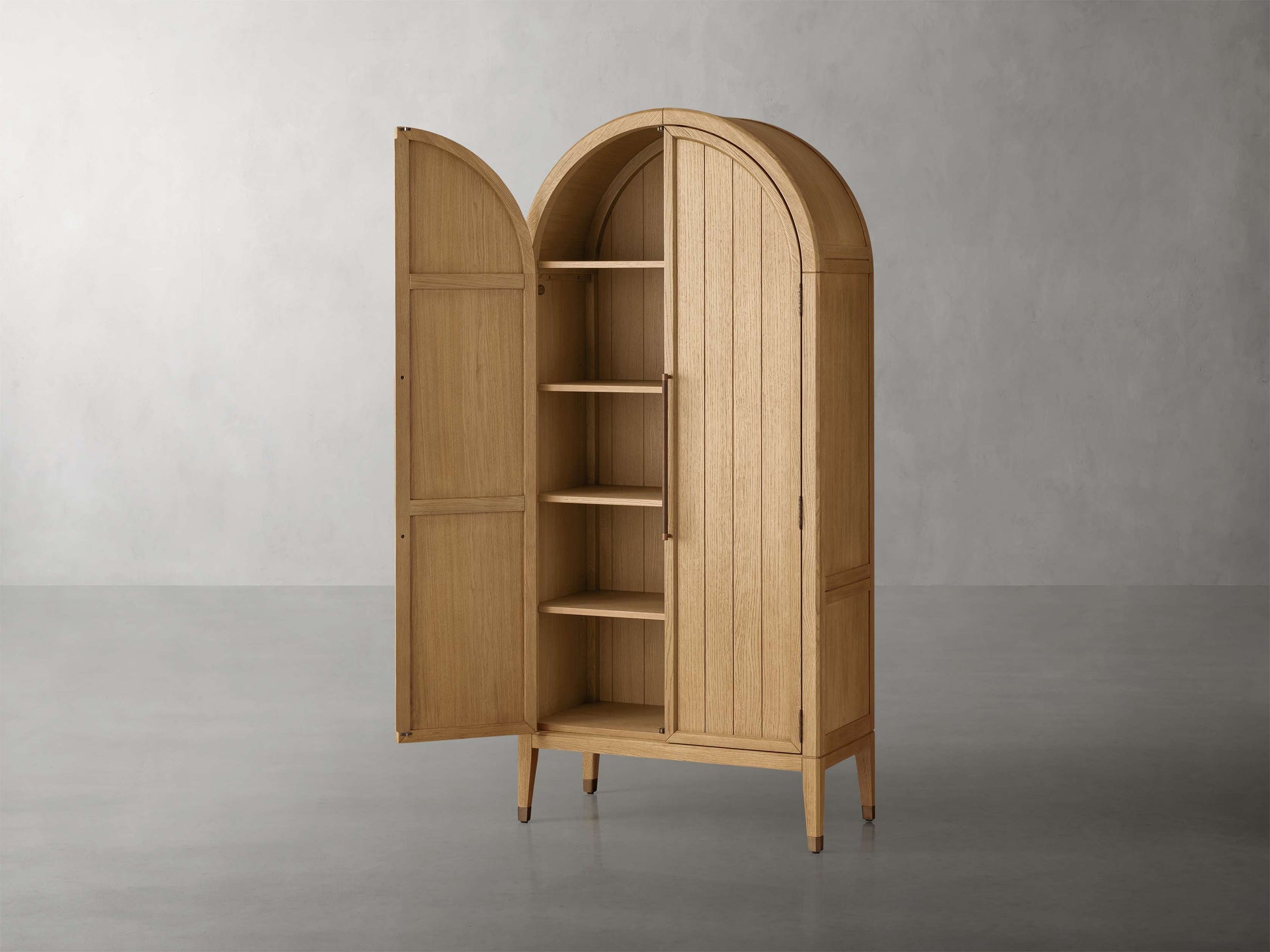 Where gentle curves meet the natural graining of oak, our artisan-crafted Hattie Collection awaits. Hattie’s generous shelves mean there’s always room to display favorite curiosities and everyday essentials.