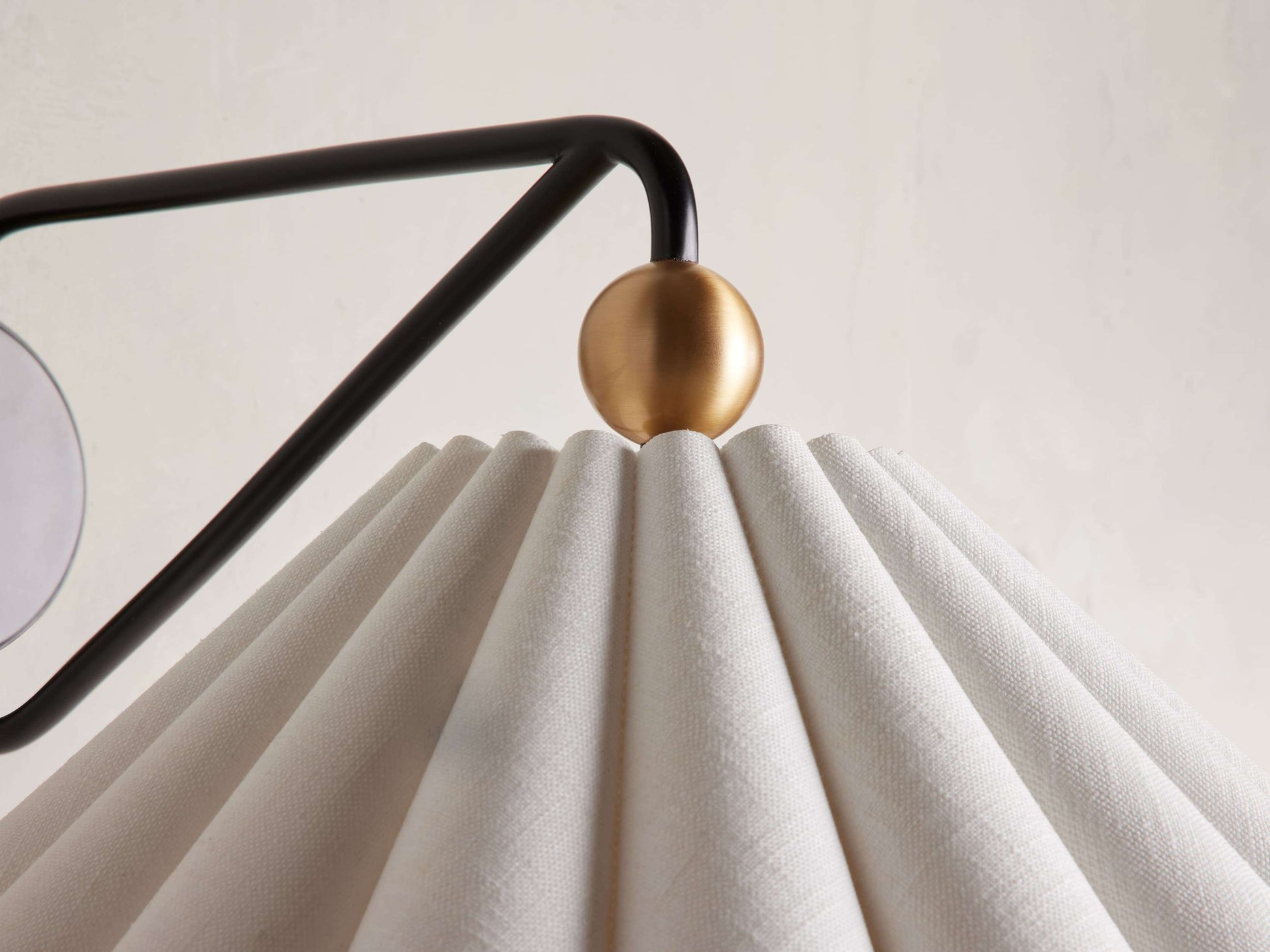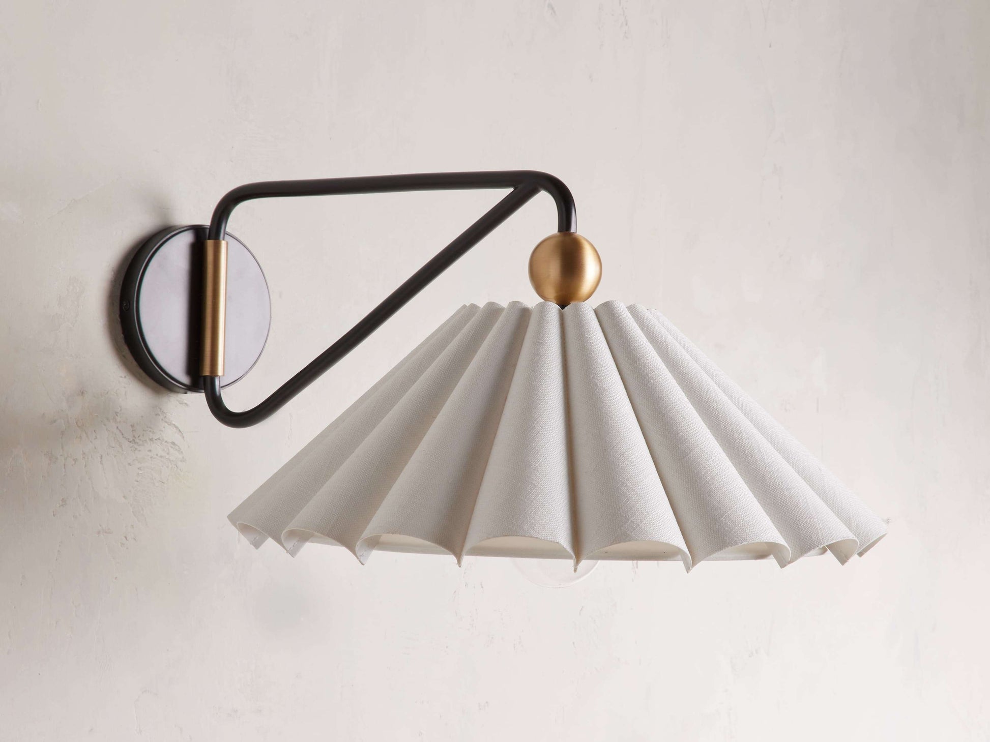 Featuring a two-tone brass finish paired with a beautiful natural linen pleated shade, our Haylen Wall Sconce conveniently swings from left to right filling your space with a relaxing glow.