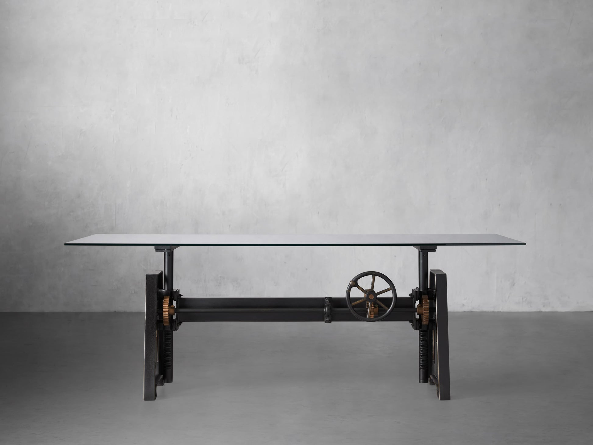 A masterpiece of modern design, the base of our Industrial Crank Desk is cast from solid iron and features a functioning wheel-and-gear mechanism. A versatile desktop, crafted from tempered glass, can be adjusted to create the perfect surface for any setting.