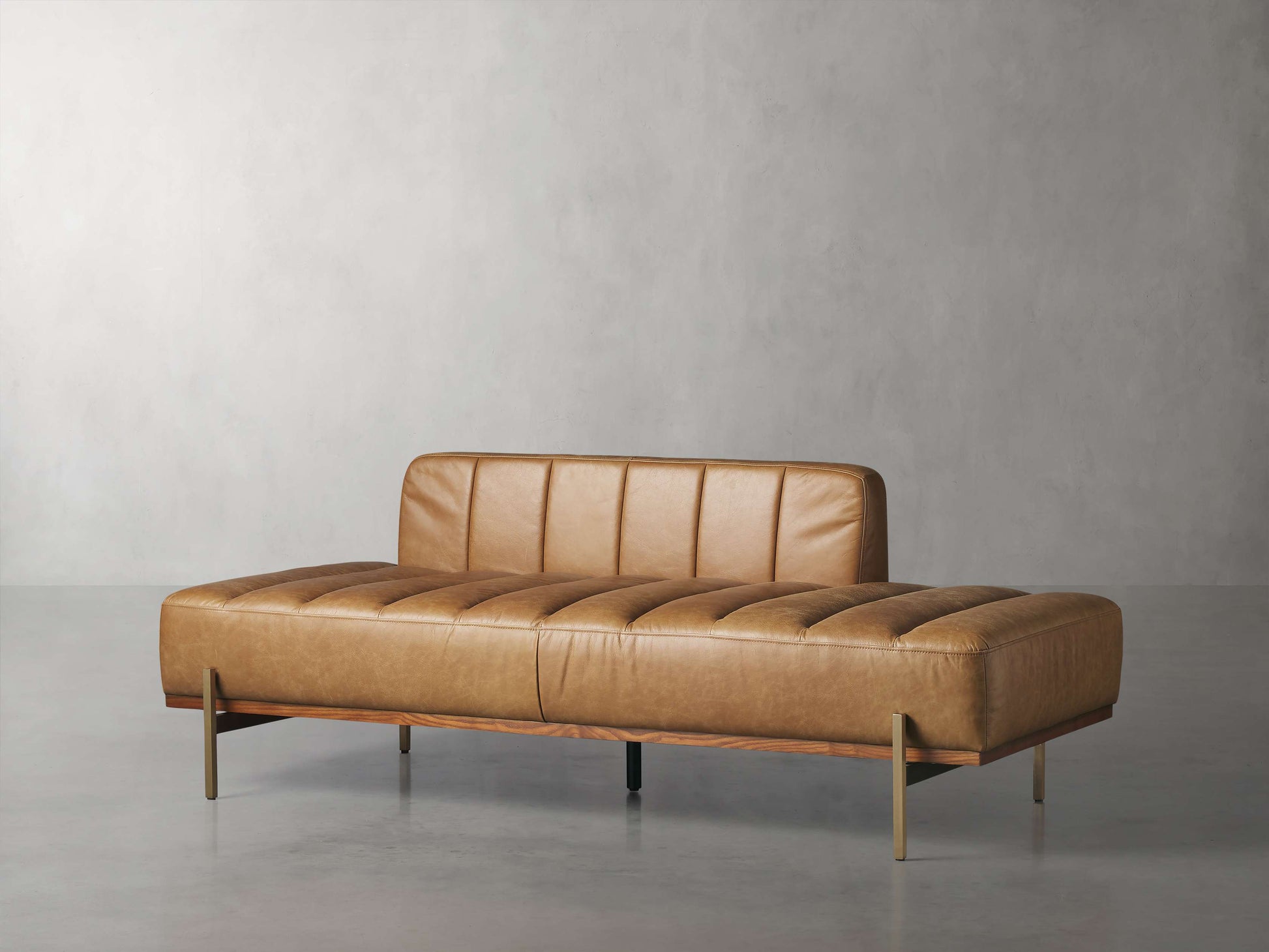 Crafted for exquisite comfort, our Lansing Collection features low-profile, open-ended designs. Top-grain leather seats and backrests are channel-stitched to create a plush, luxurious aesthetic, while the natural wood bases are accented with brass supports for added style and contrast.