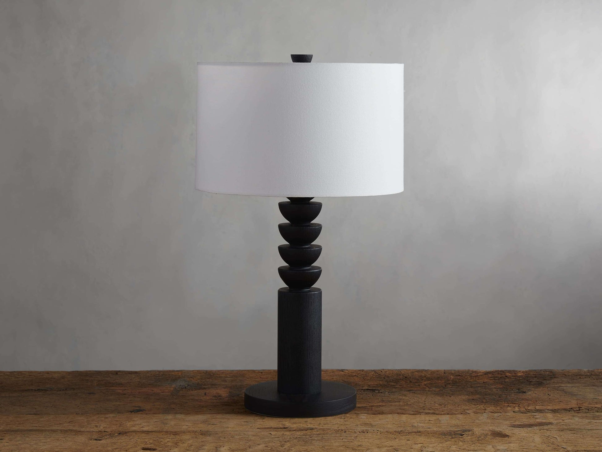 - Crafted from natural oak wood in either a natural or black finish complemented by a linen shade.