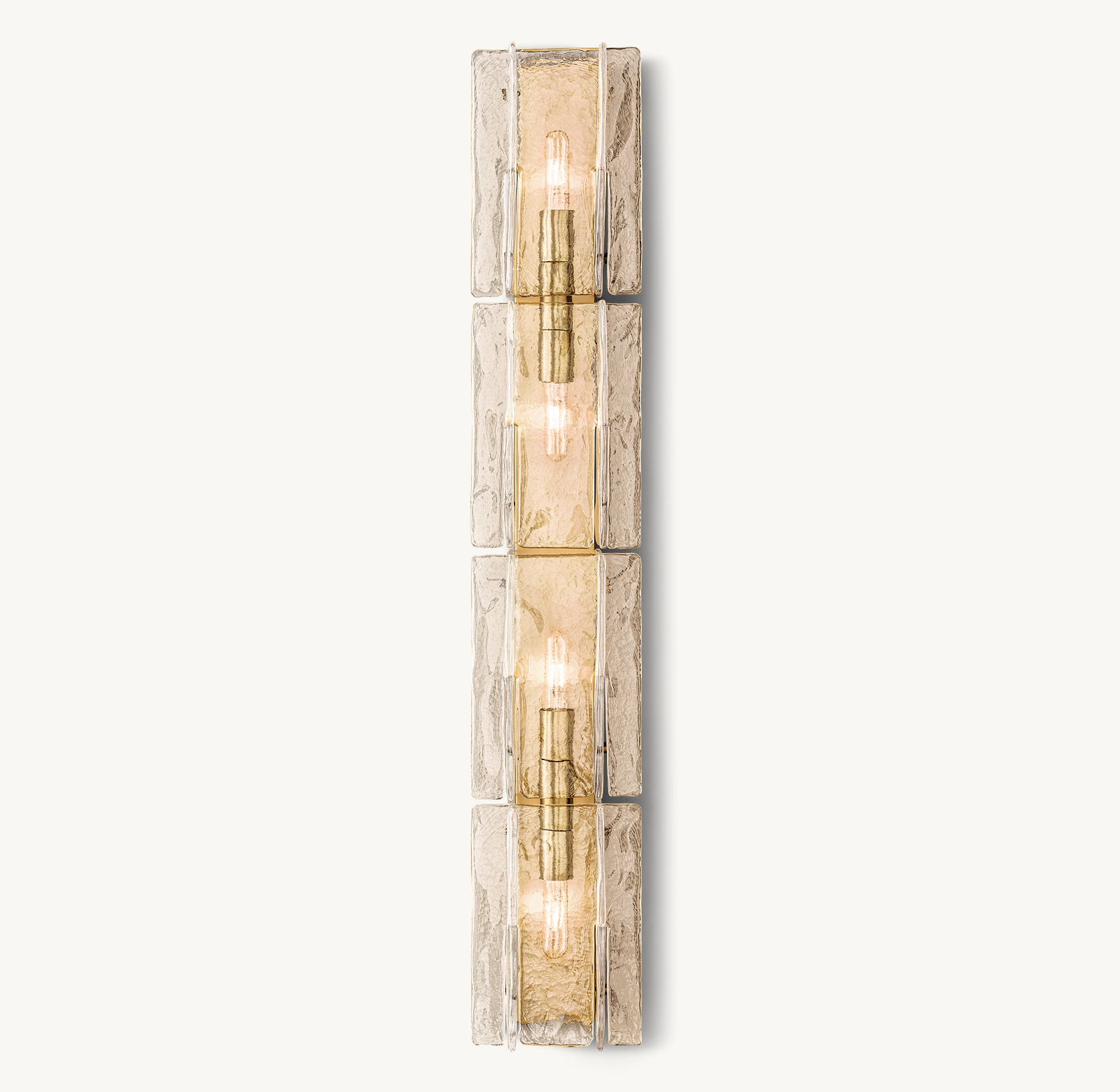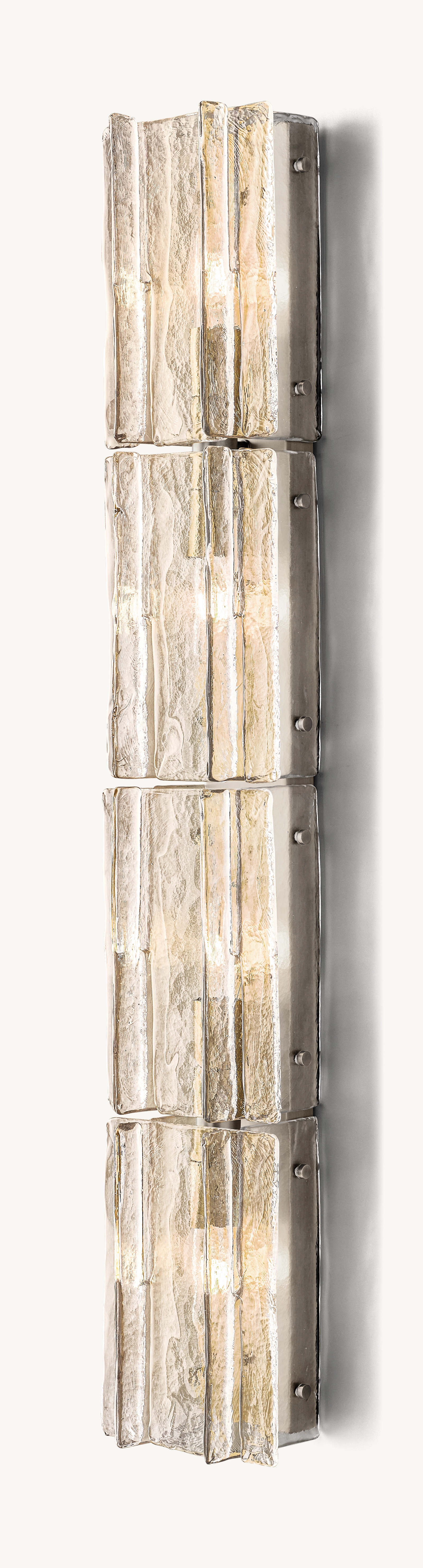 Crafted of solid cast glass, the collection's interlocking planes recall the geometric precision of the midcentury International Style. A study in repetition and rhythm, the linear form employs open space to lend a weightless feel. Gently rounded corners on the fluid, rippled panes subtly soften the outline, while diffused light glows from within.