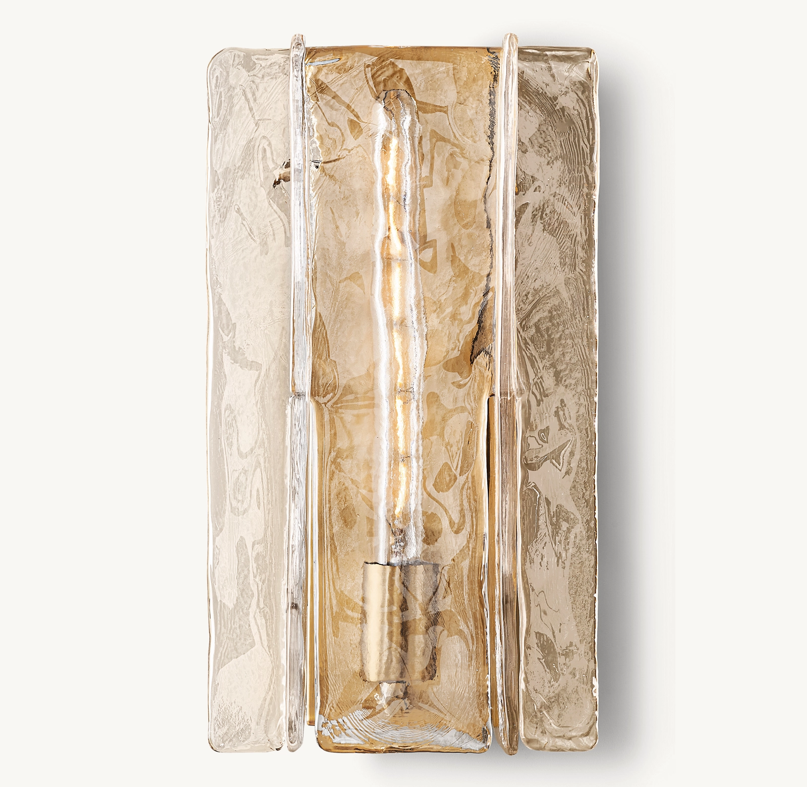 Crafted of solid cast glass, the collection's interlocking planes recall the geometric precision of the midcentury International Style. A study in repetition and rhythm, the linear form employs open space to lend a weightless feel. Gently rounded corners on the fluid, rippled panes subtly soften the outline, while diffused light glows from within.