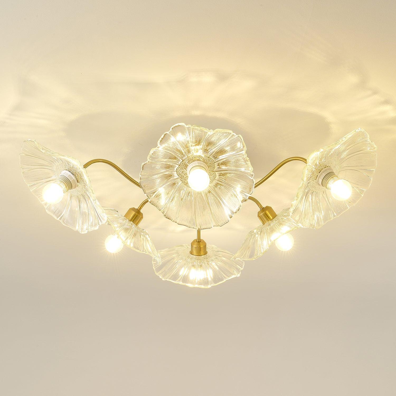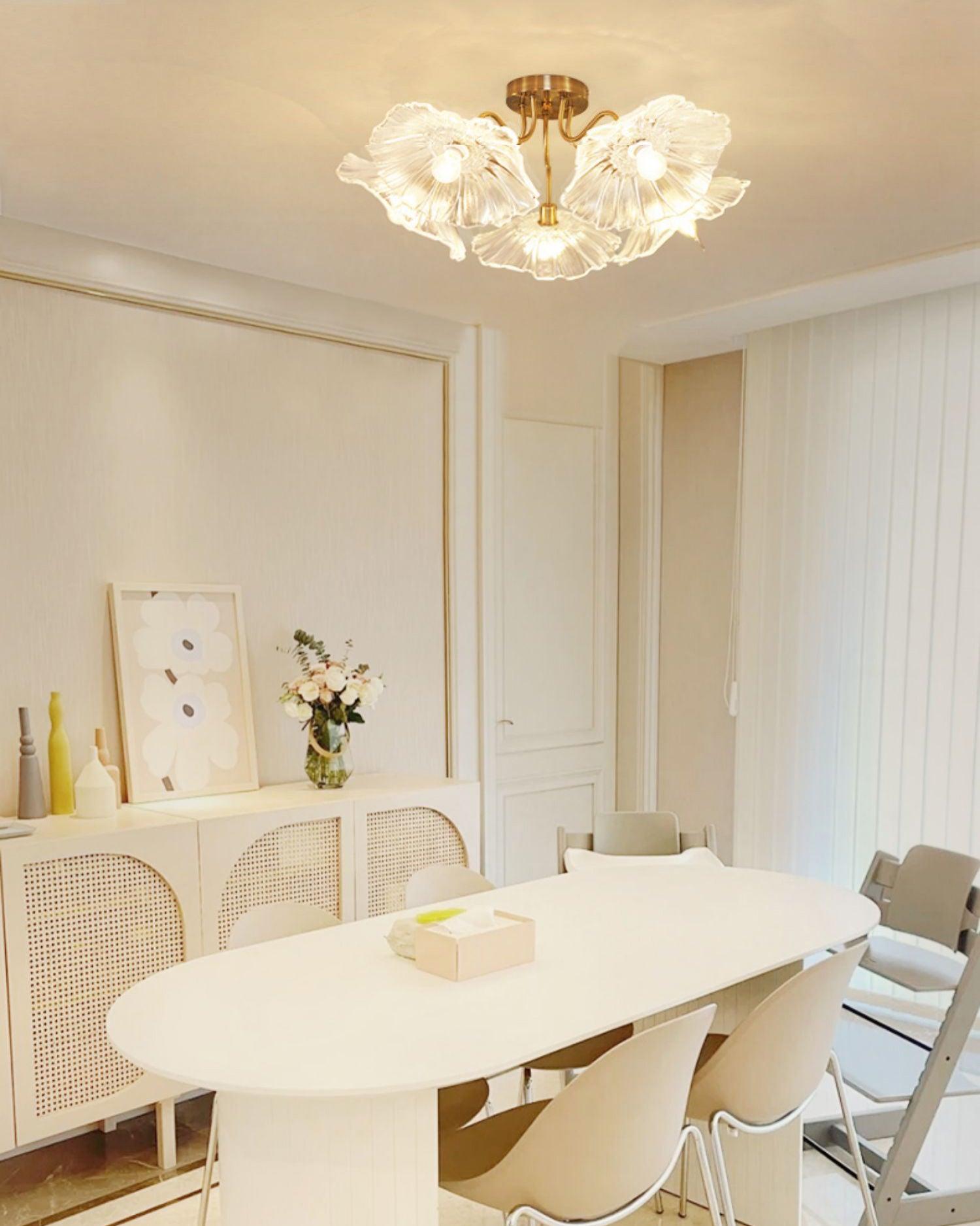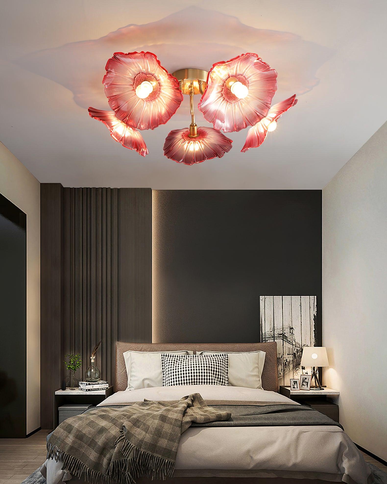 - Flower-shaped glass lampshade, available in clear and purple red shades.
