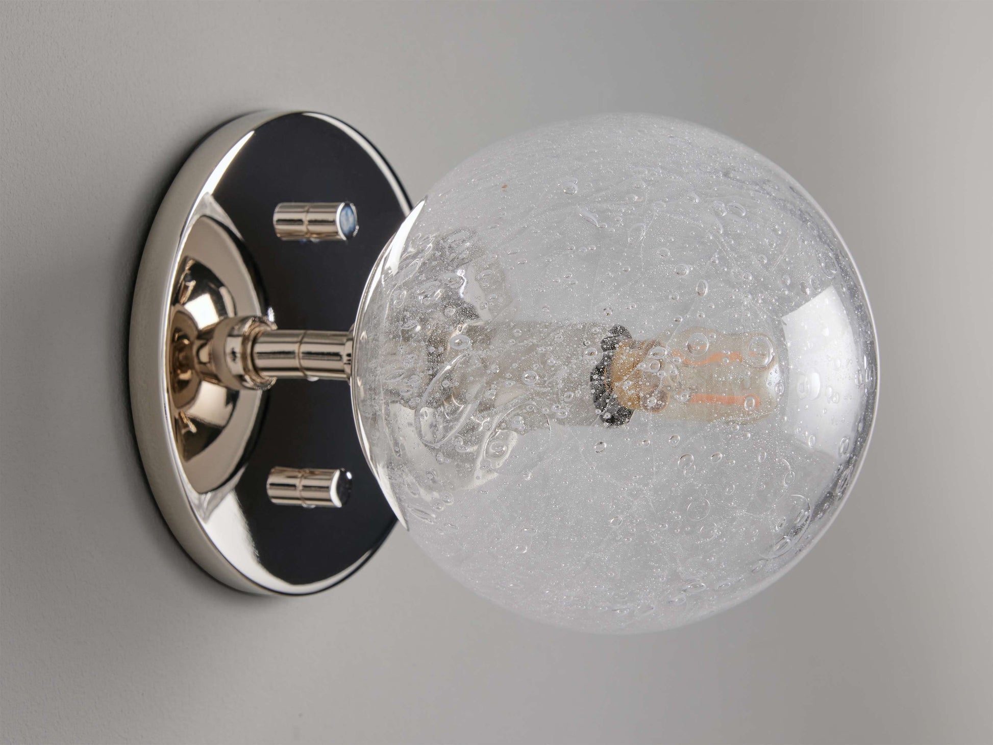 - Crafted from burnished brass, bronze, or polished nickel-finished steel and aluminum with hand-blown glass globes.