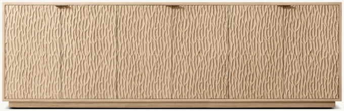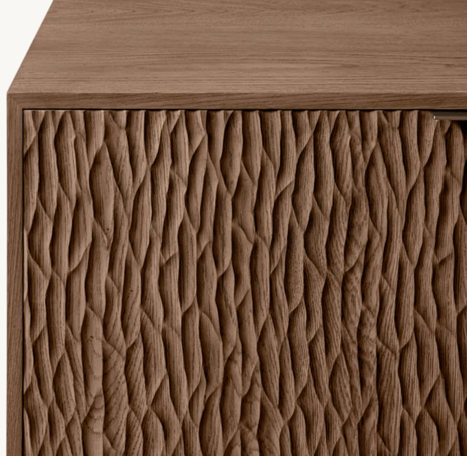 - Oak door fronts feature a deeply textured, chiseled surface in a meticulously crafted pattern