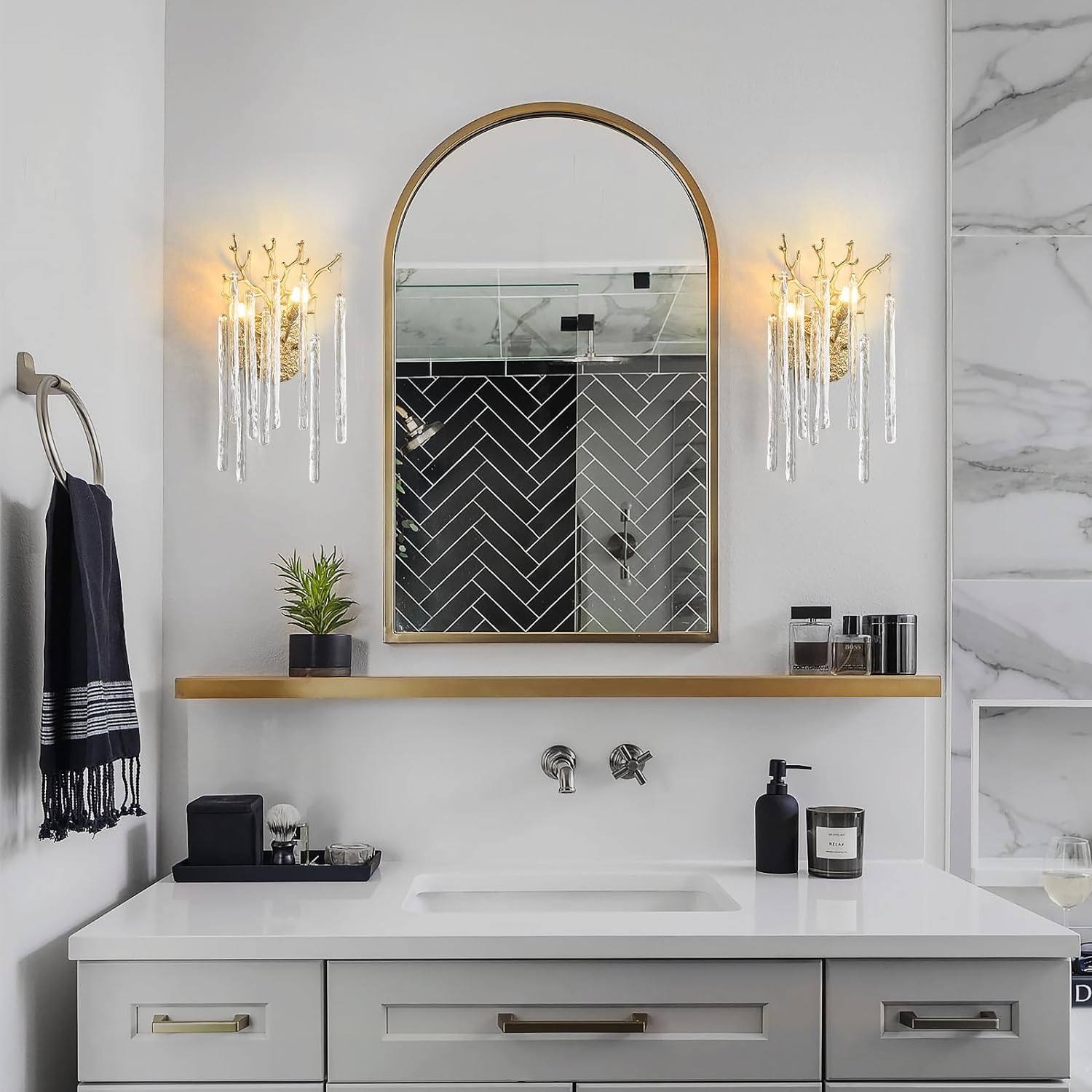 - 【Modern Crystal Wall Sconce】This Beautiful Crystal Sconces Design Is Inspired By Nature, The Wall Sconces Is Shaped Like A Leafy Branch. Crafted From Delicate Gold Decorative Branches And Stunning K9 Clear Crystals, The Branch Wall Light Is Sparkling And Luxurious, Symbolizing The Beauty Of Love, Career, Family And Friendship. Under The Illumination, The Whole Fixture Presents A Natural Artistic Beauty.