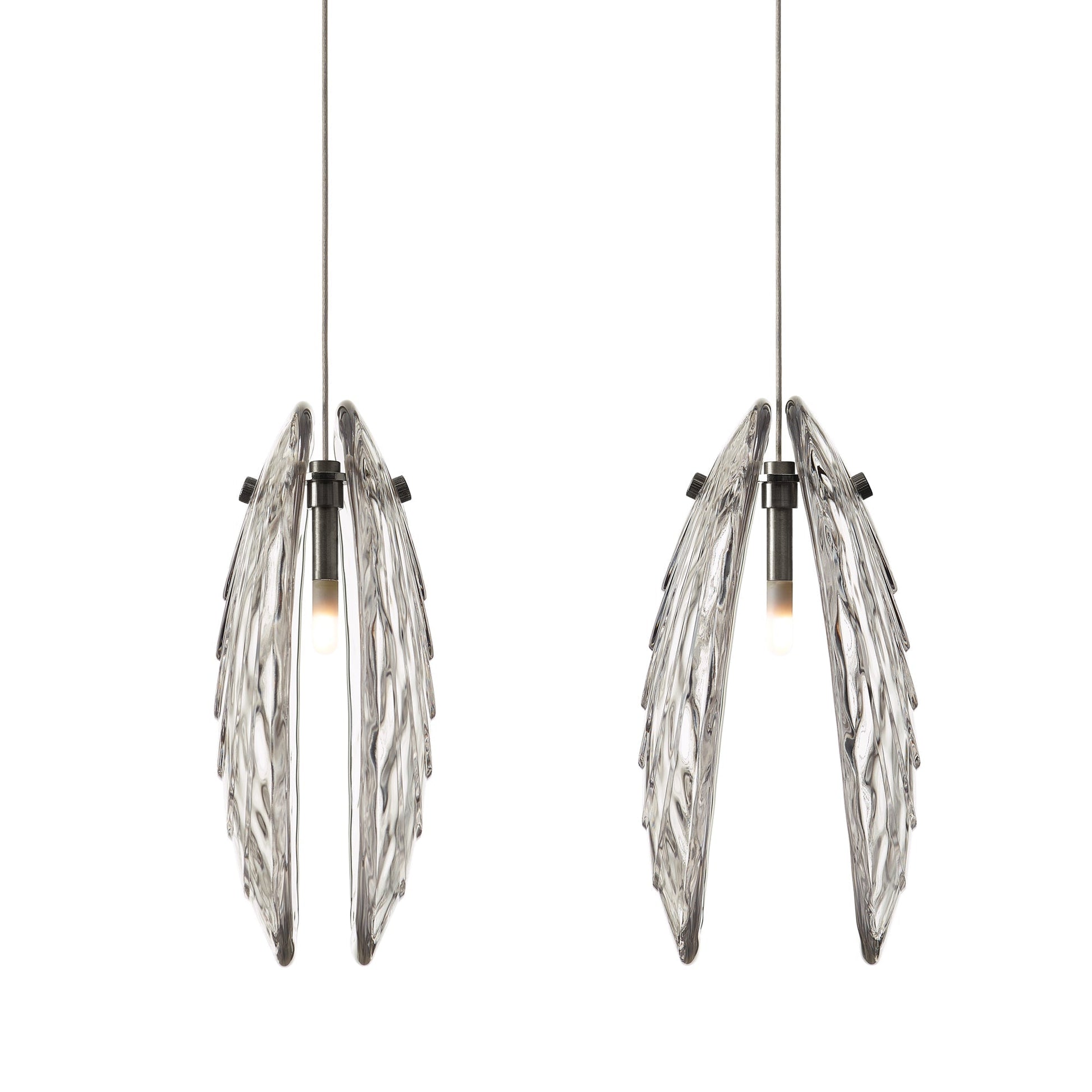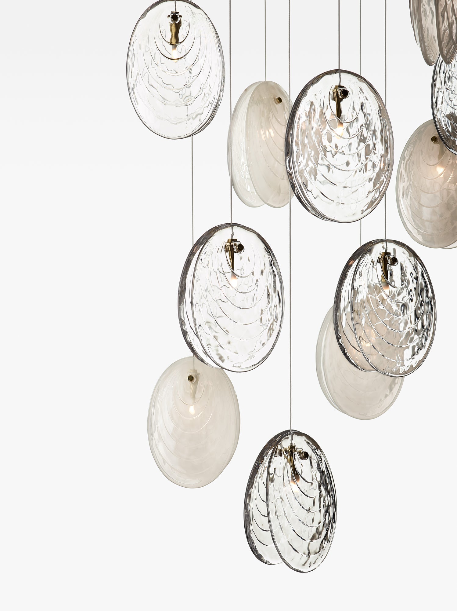 The Mussels Pendant is inspired by the simple yet sophisticated shape of shells. Two Crystal rippled shells surround a light source to create an elegant and organic fixture. Supplied with two different-sized fixings to choose the angle of the shell opening. TRIAC dimming.