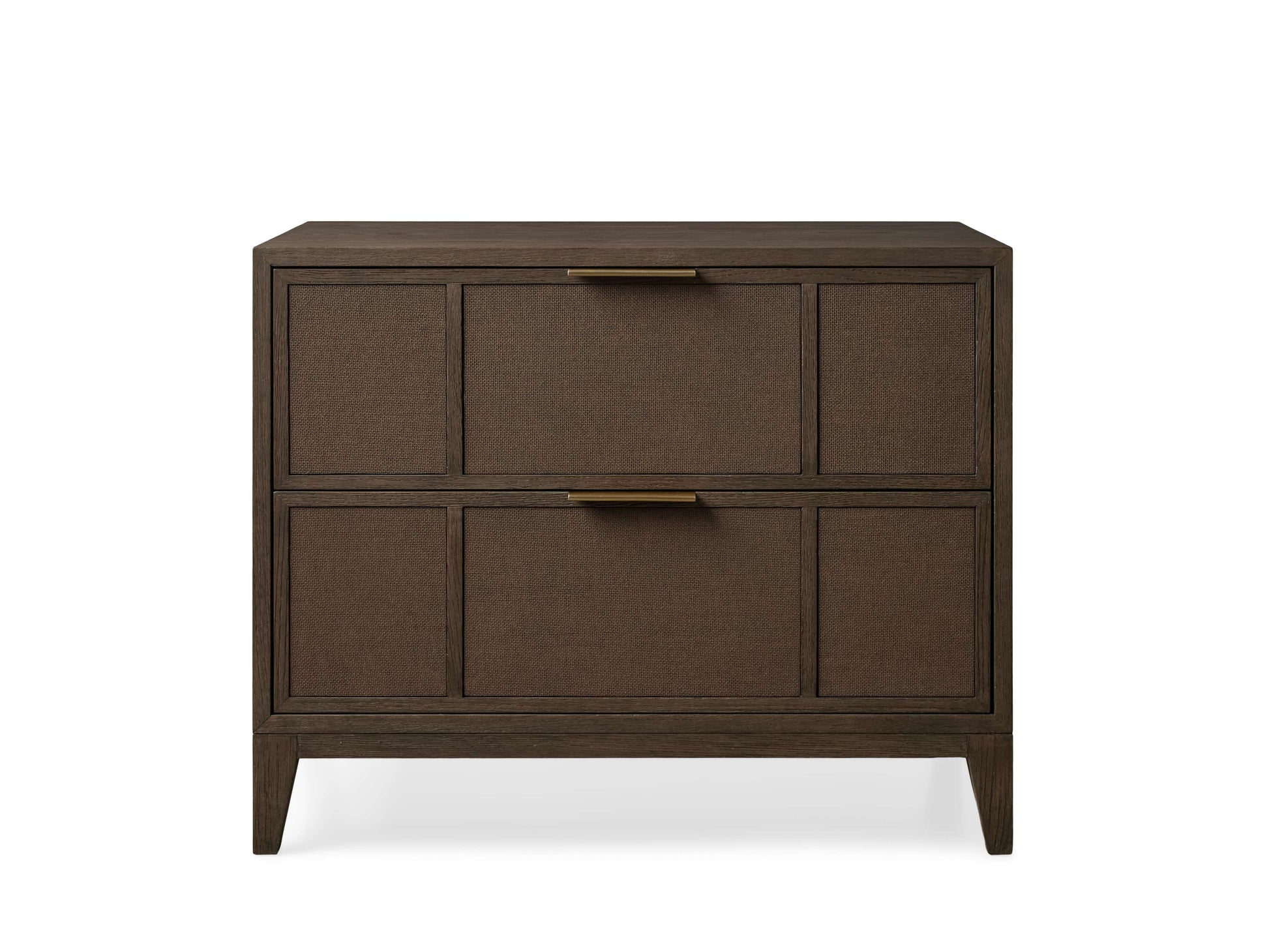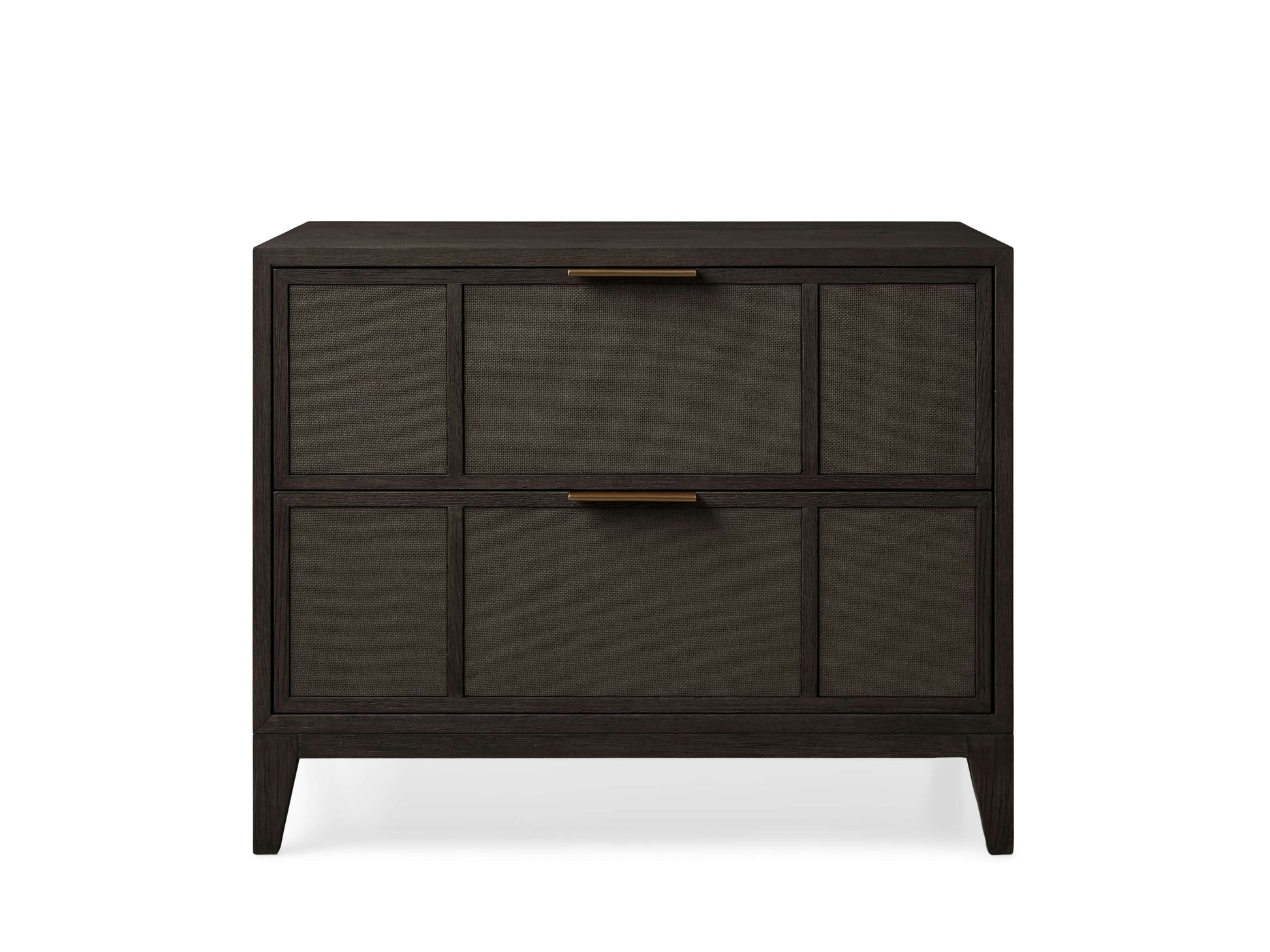 - Drawers sit atop under-mount glides and feature brass drawer pulls.