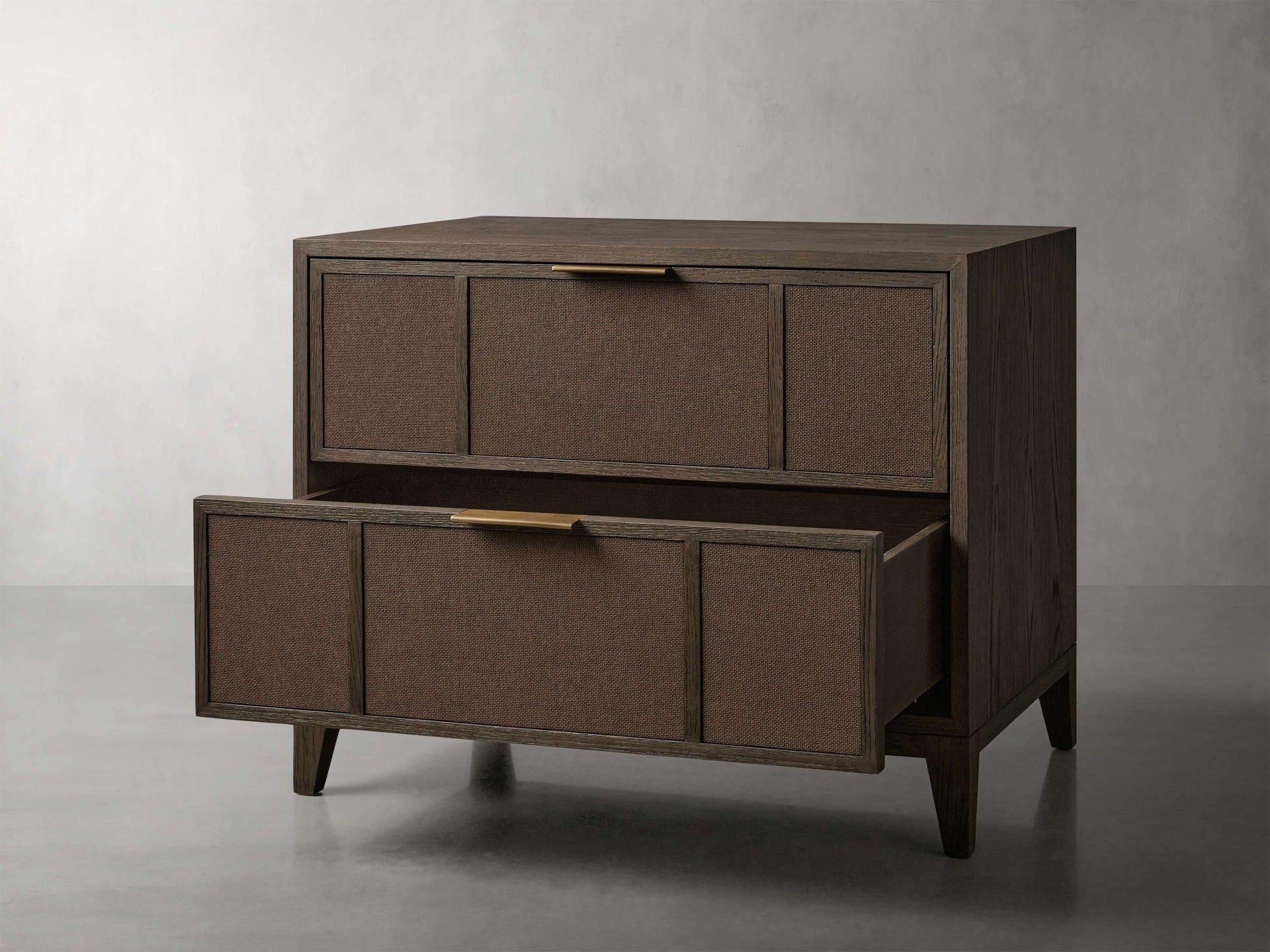 - Crafted from a blend of solid oak wood and oak veneers with textured raffia drawer fronts.