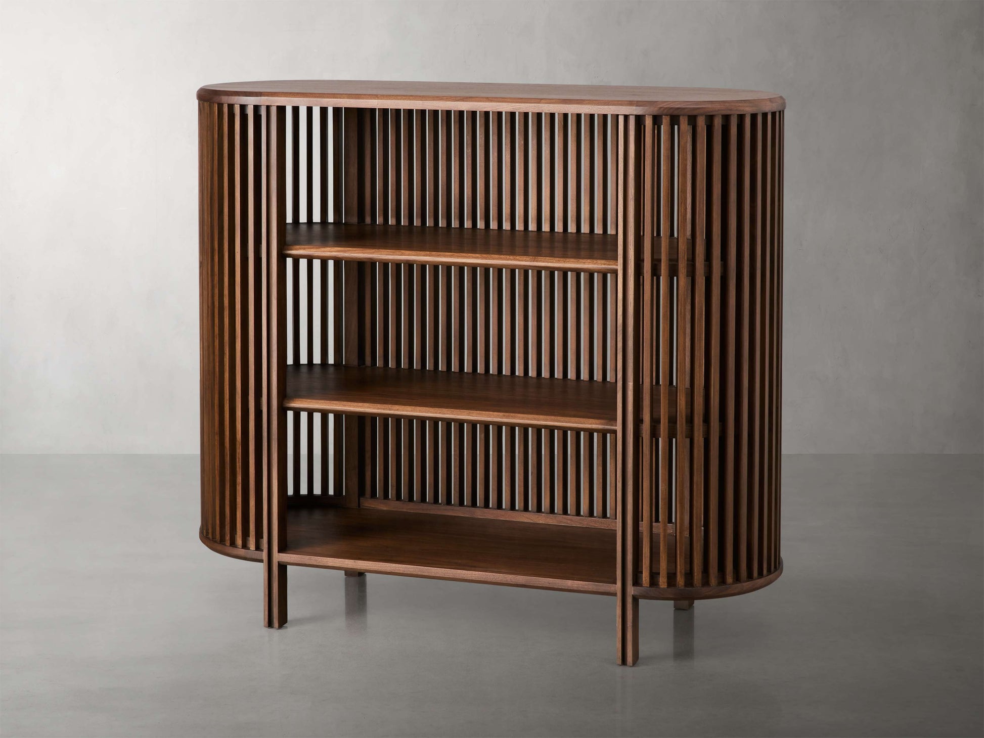Display your favorite trinkets or keep your barware close at hand with our Paige Collection. Crafted from beech wood and walnut veneers, Paige’s linear open-reeded detailing surrounds the entire piece so it can float in a room. Boasting soft curves and wide fixed shelving, Paige is a stunning, open-storage solution.