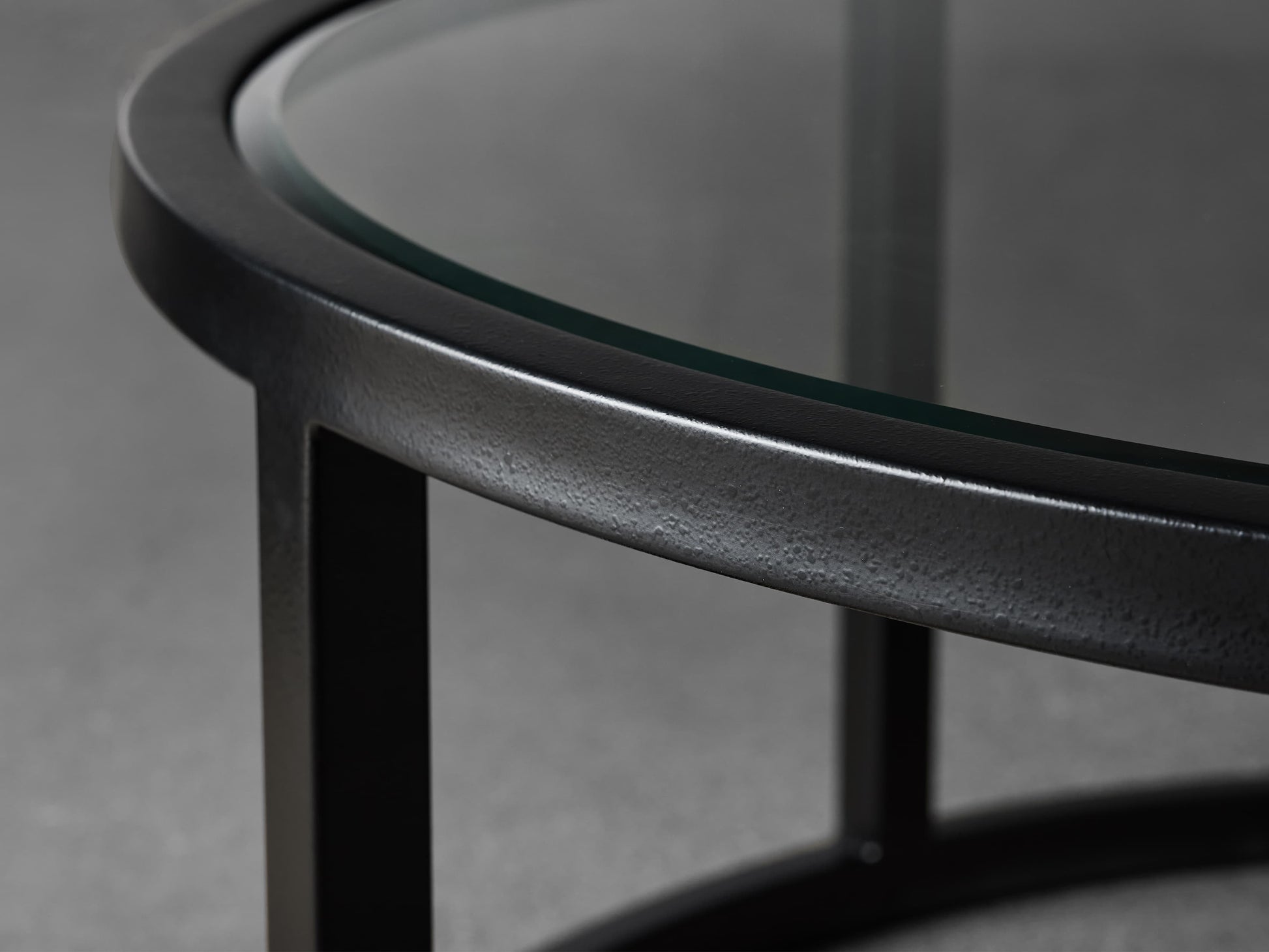 - A beveled, tempered glass tabletop framed in cast iron allows your surrounding décor to take center stage.