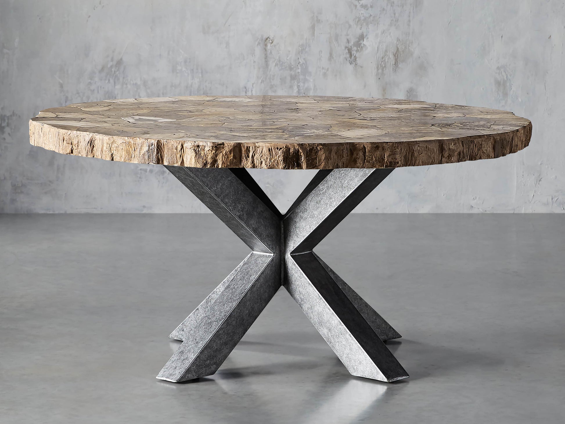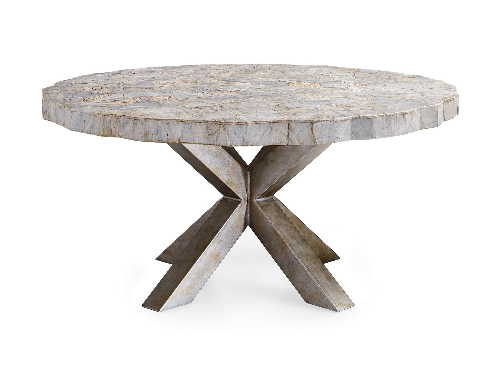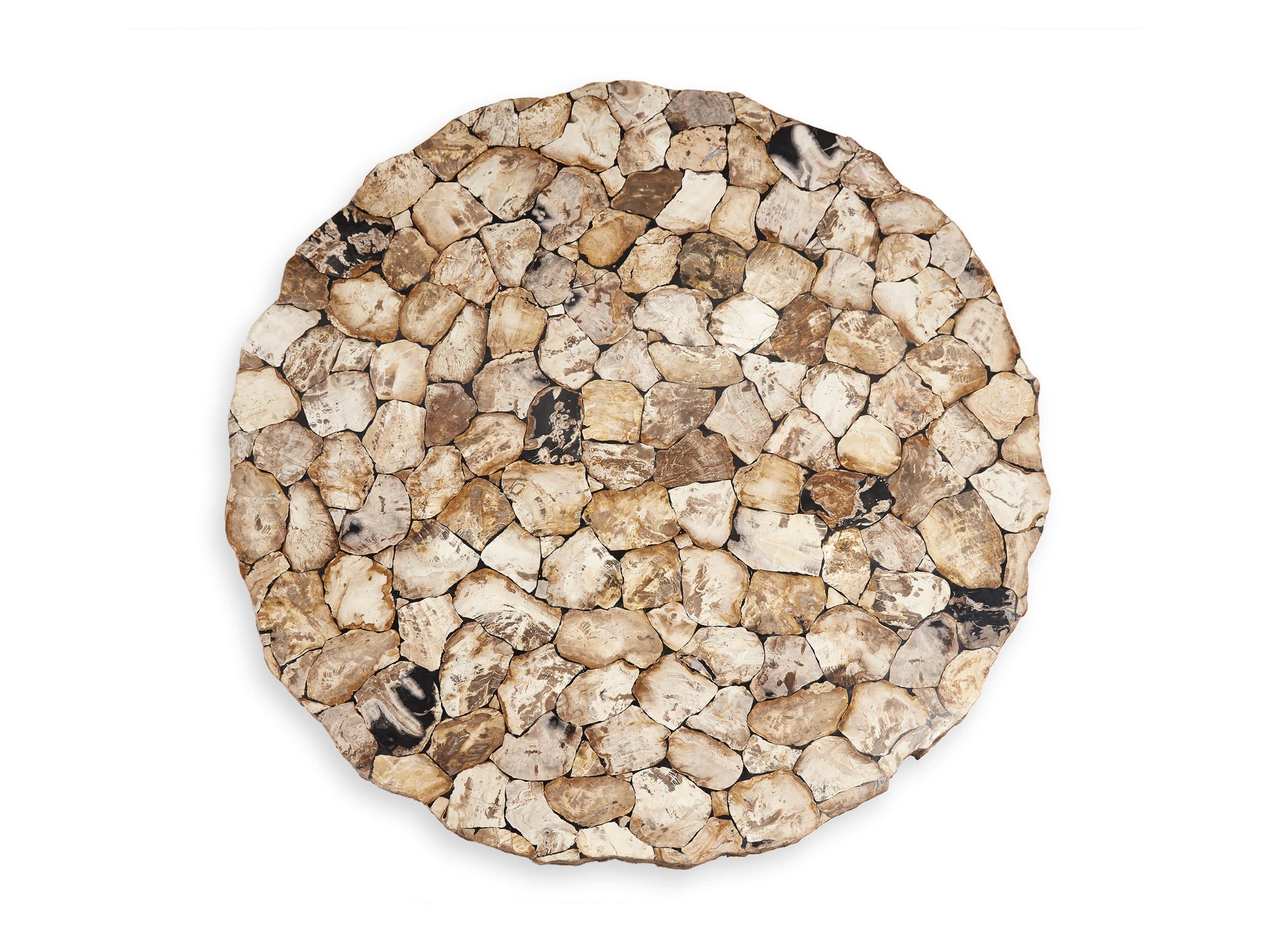 - Handcrafted petrified wood surfaces are assembled using petrified wood veneers and solid wood and are complemented by artisan-finished iron base featuring an antiqued, dark grey patina.