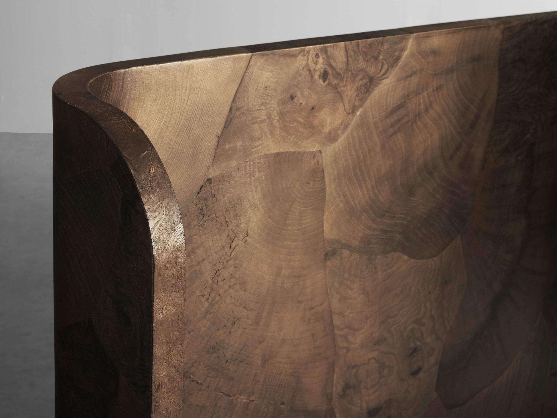 Following heavy storms, our artisan partners in Mexico search the forest for fallen trees of Mexican ash, salvaging as many as they can. Each log is oyster-cut, arranged, and stained by hand, united with fragments of sustainably grown European ash burl to create incredible, mosaic-like surfaces. Bases crafted from naturally oxidized metal add the perfect contrast, together forming the rustic beauty of our remarkable Polanco Collection.