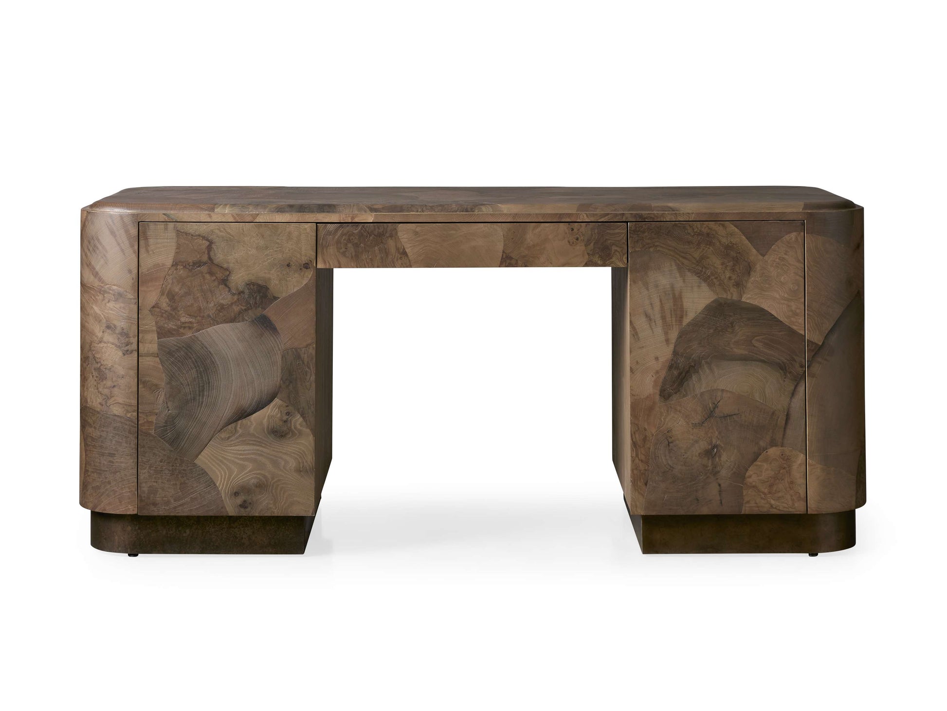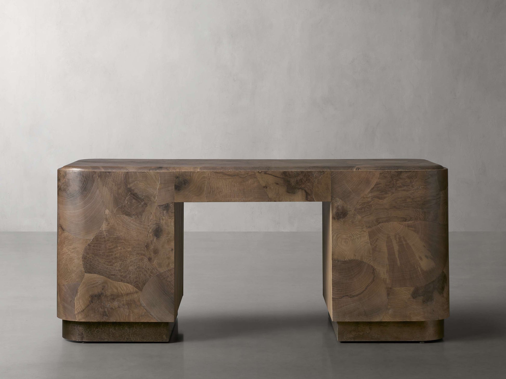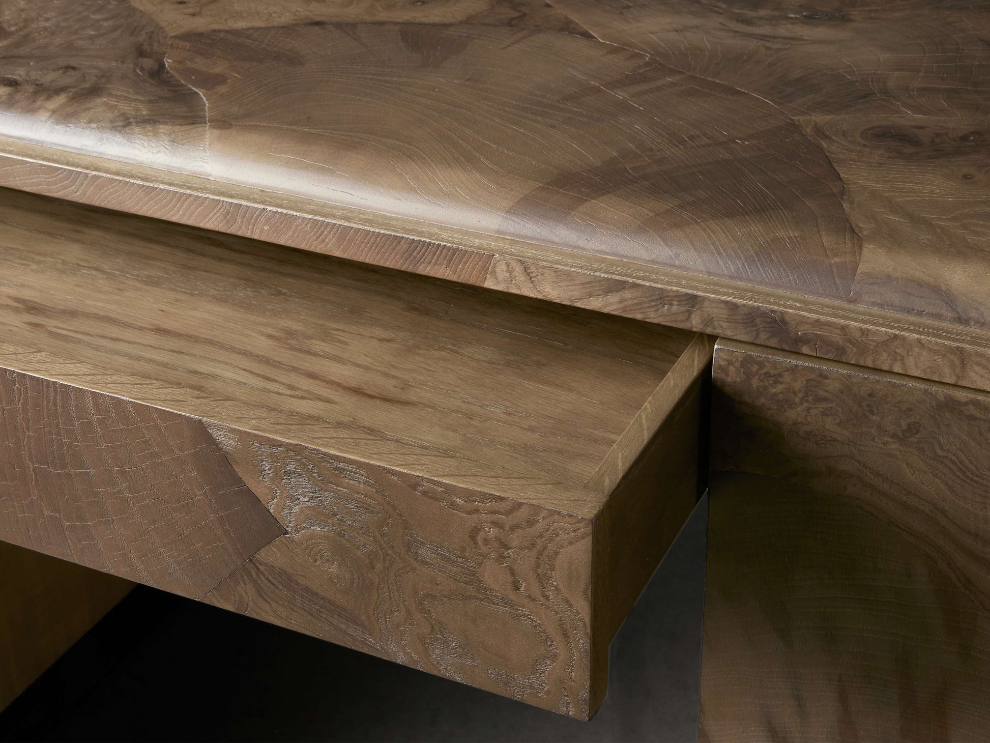 Following heavy storms, our artisan partners in Mexico search the forest for fallen trees of Mexican ash, salvaging as many as they can. Each log is oyster-cut, arranged, and stained by hand, united with fragments of sustainably grown European ash burl to create incredible, mosaic-like surfaces. Bases crafted from naturally oxidized metal add the perfect contrast, together forming the rustic beauty of our remarkable Polanco Collection.
