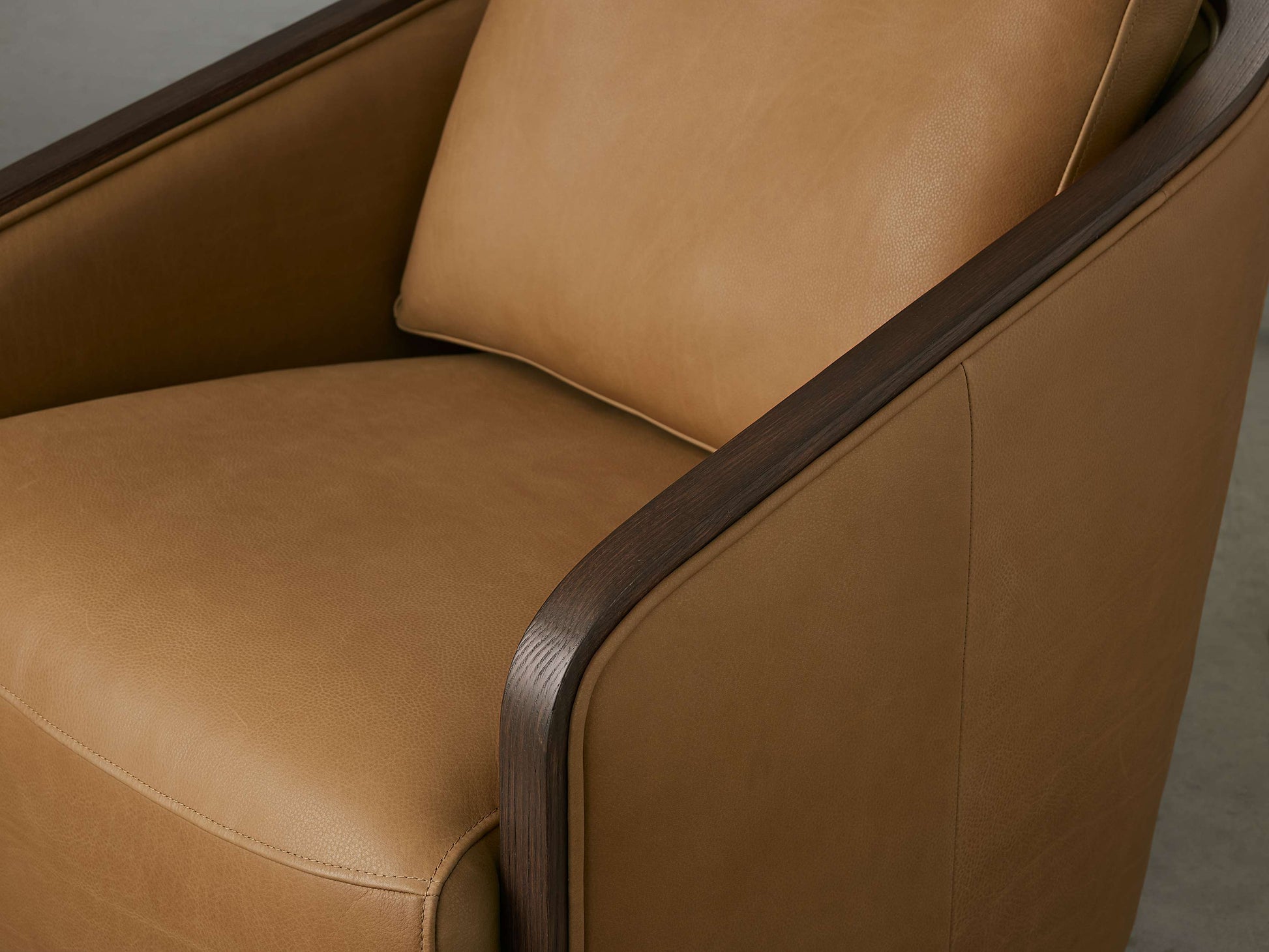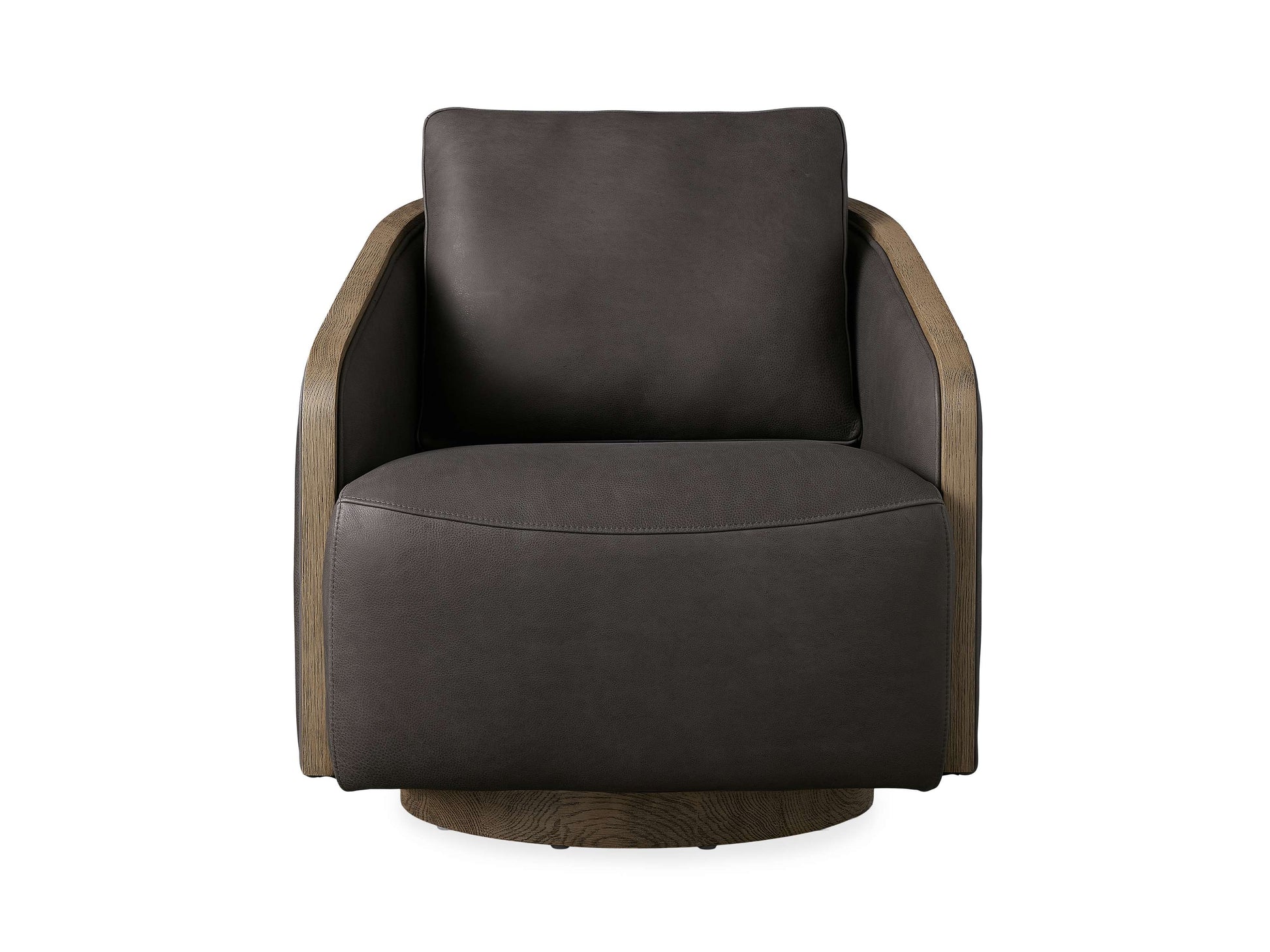 - Exposed oak edges on the arms and swivel base complement the rich, soft leather tones of the cushions.