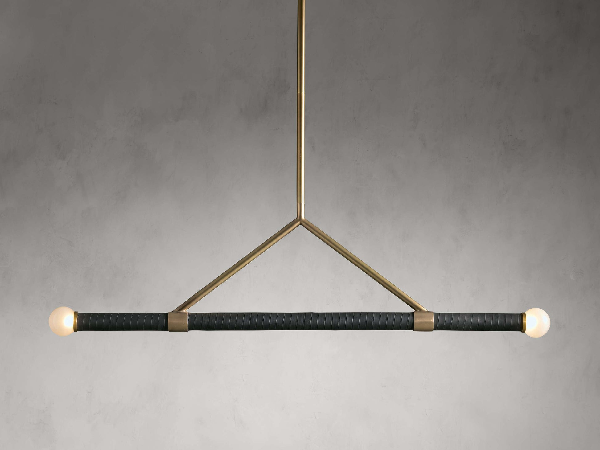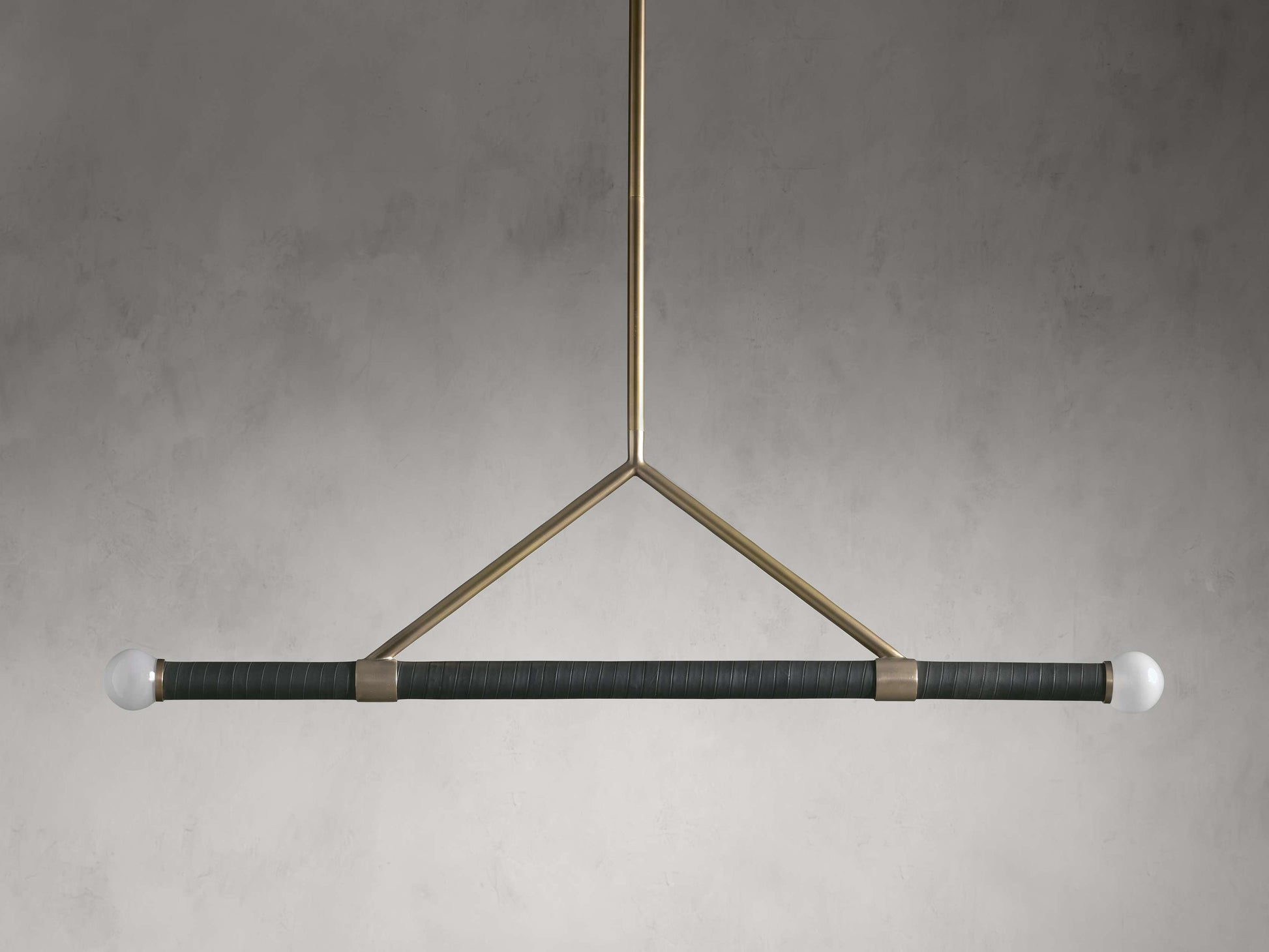 - This Arhaus-exclusive collection is crafted from burnished brass or bronze-plated steel with wrapped leather detailing and two frosted glass globes.