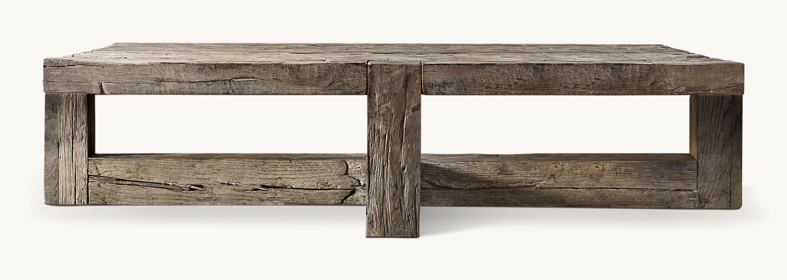 - Tabletop bears the patina of reclaimed wood and is accented with distinctive cracks, exposed knots and imperfections.