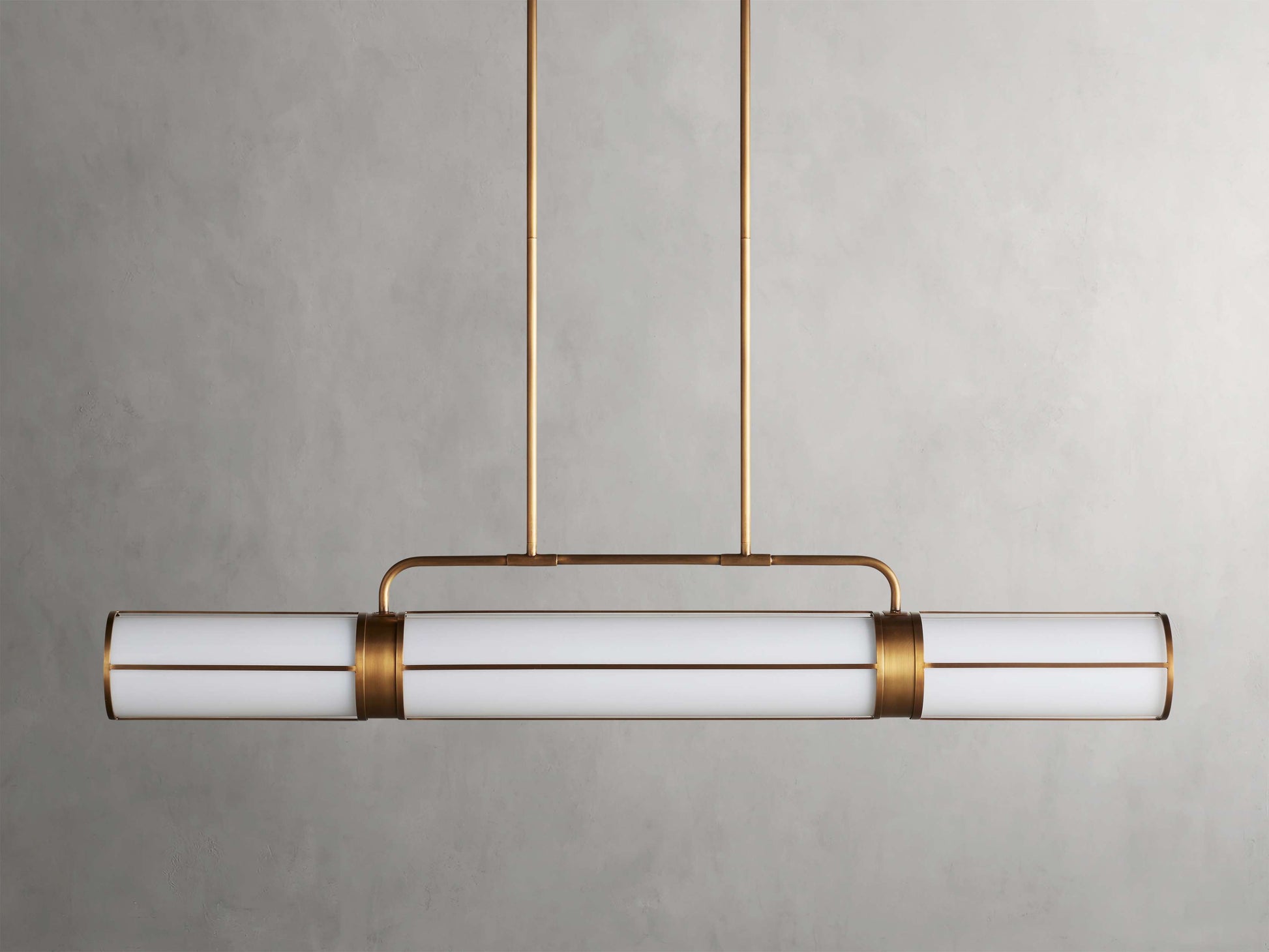 - Arhaus-exclusive lighting collection crafted from milk glass and burnished brass or bronze-plated steel.
