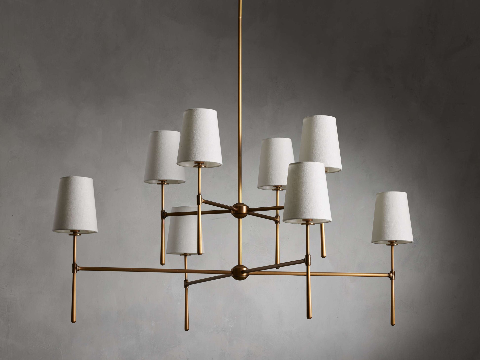 - Crafted from steel with a bronze plated or burnished brass finish and tapered linen shades.