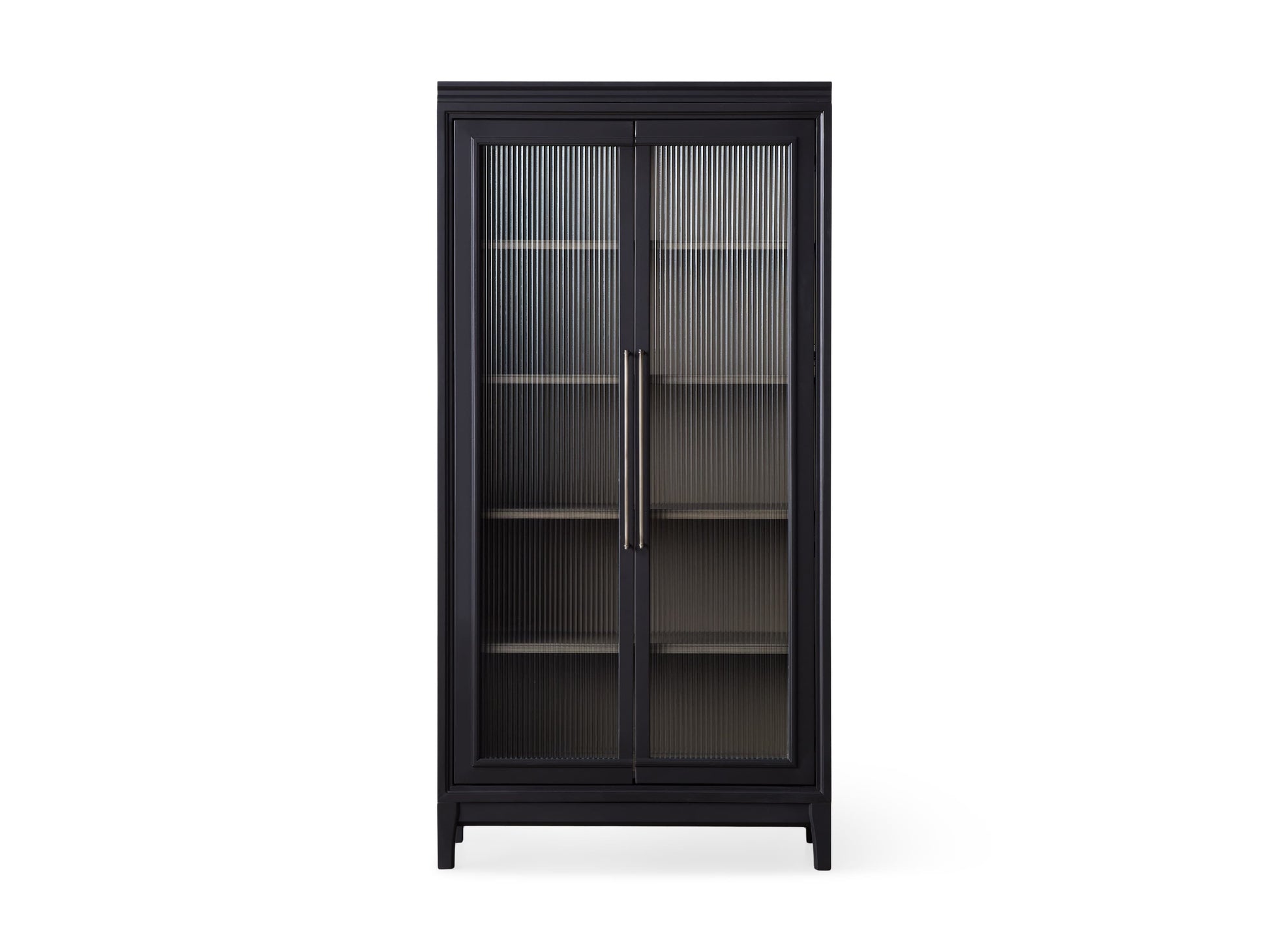 - Cabinet doors are accented with iron pulls finished in brass or pewter tones.