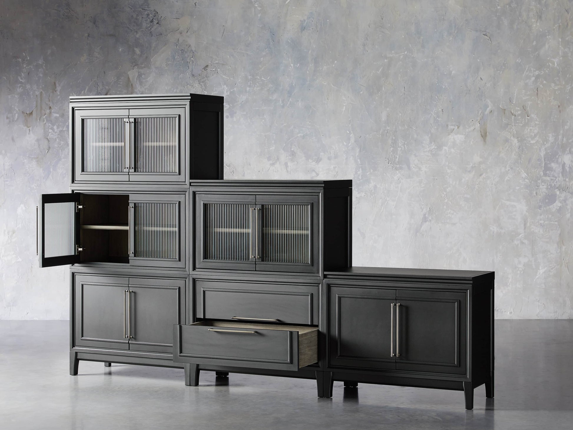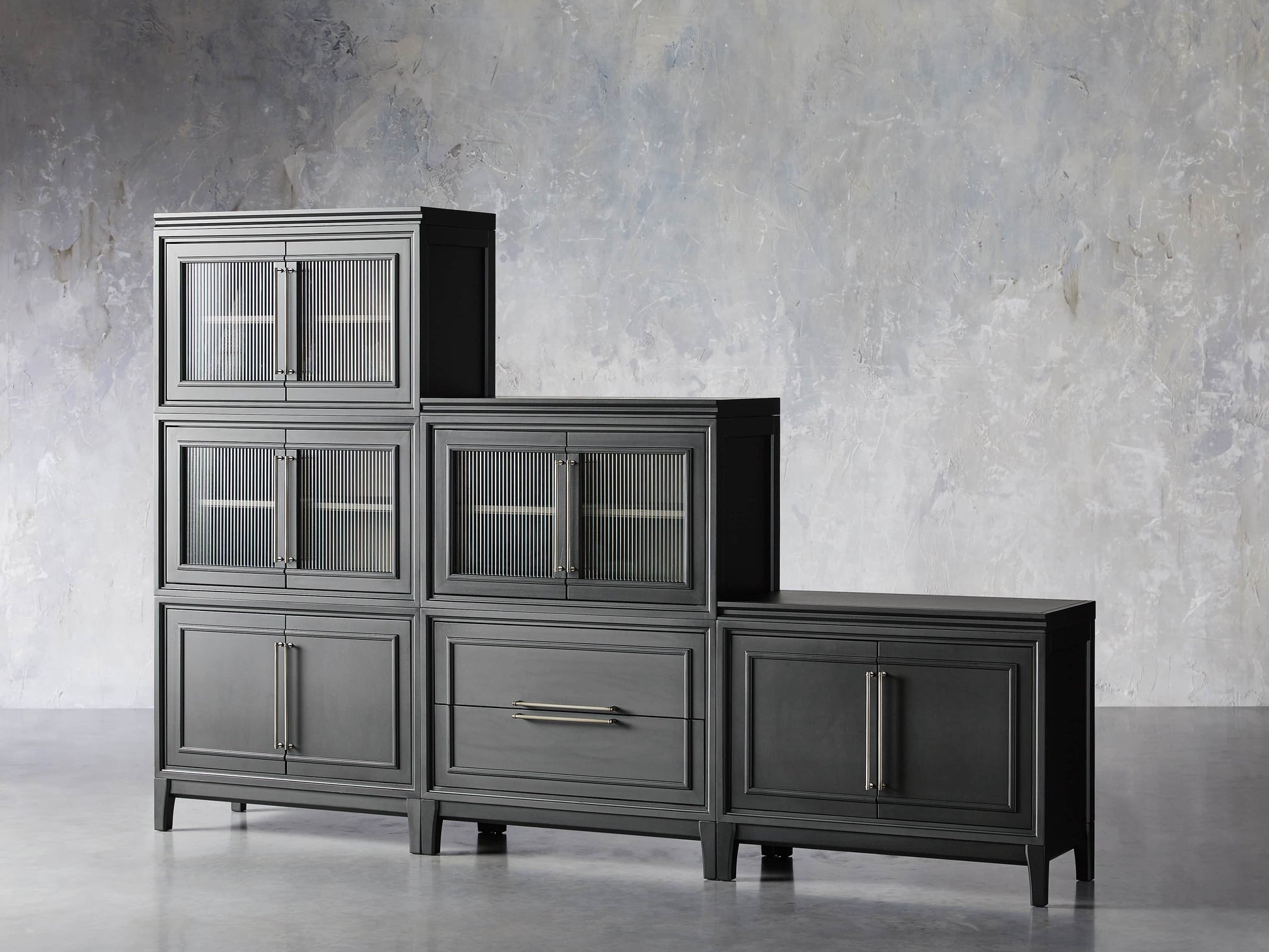 Featuring an artfully crafted modular design built for function as well as fashion, our Rowan Collection can be arranged to fit any space. Pieces crafted by Indonesian artisans are hand-painted and hand-stained, resulting in a clean, modern aesthetic accented by iron hardware—finished in pewter or brass tones. Glass-door cabinets are adorned with reeded glass, which draws the eye upward, adding unique texture and subtly obscuring what’s inside.