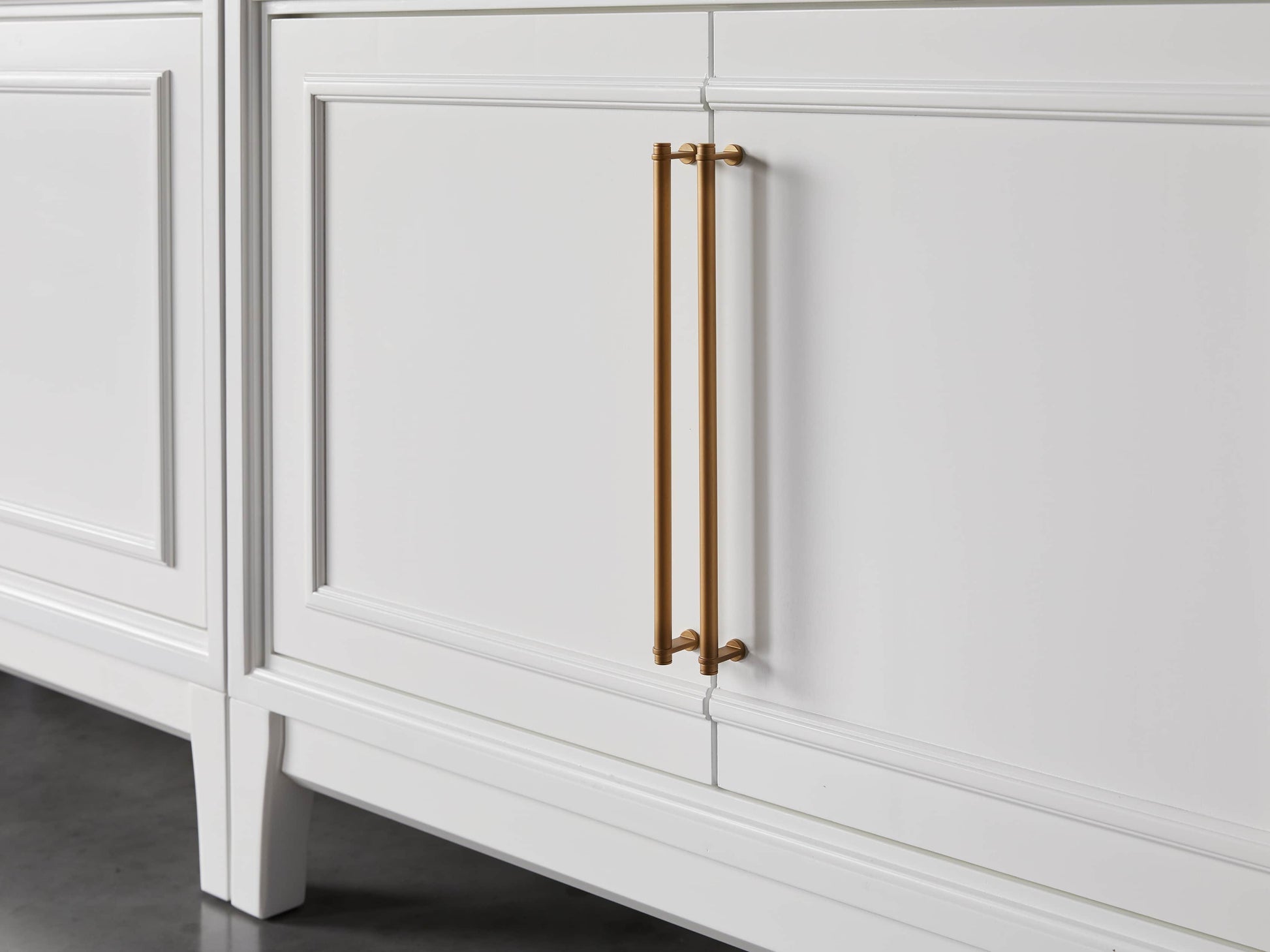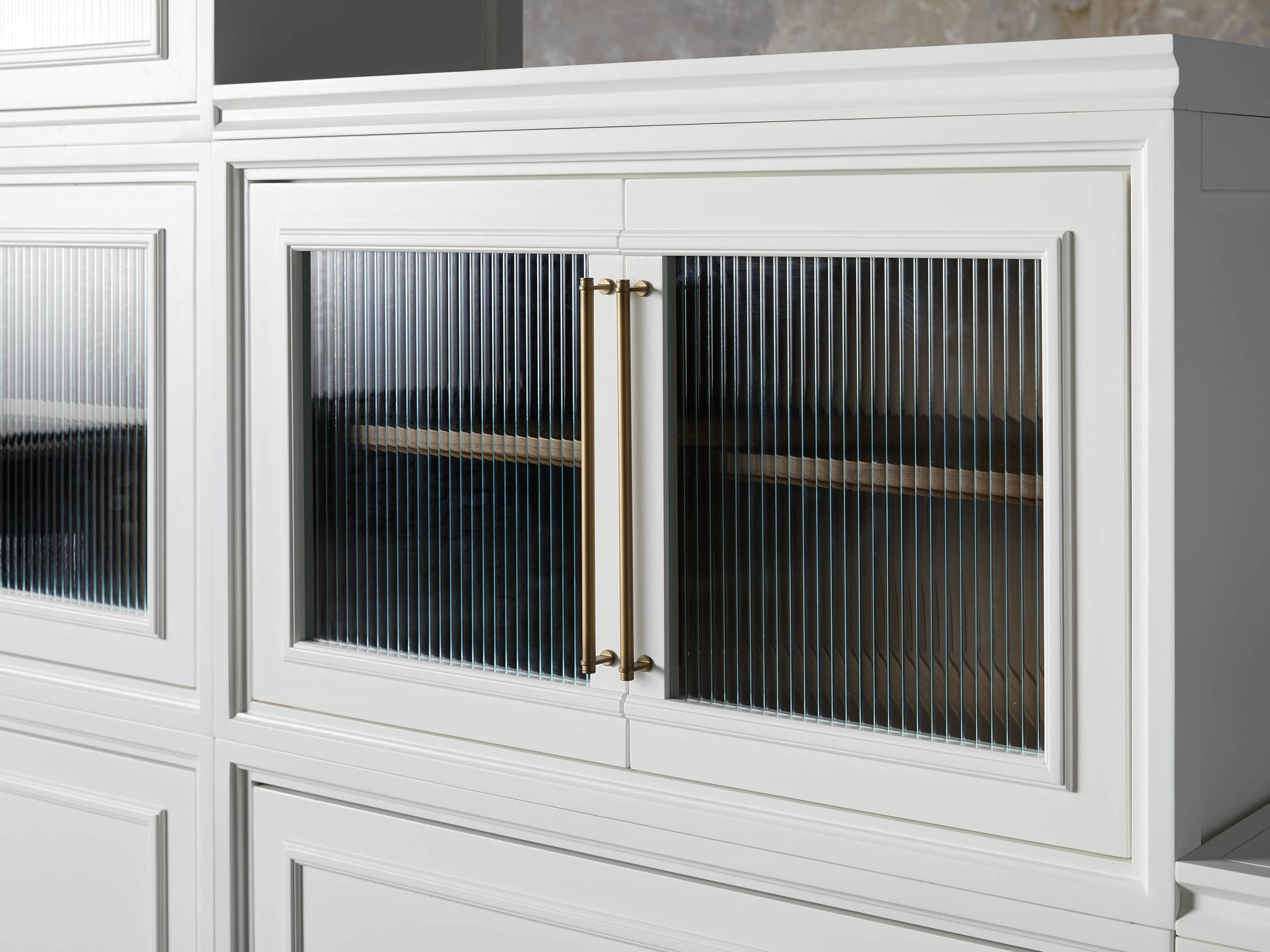 - Glass-door cabinets feature reeded detailing.