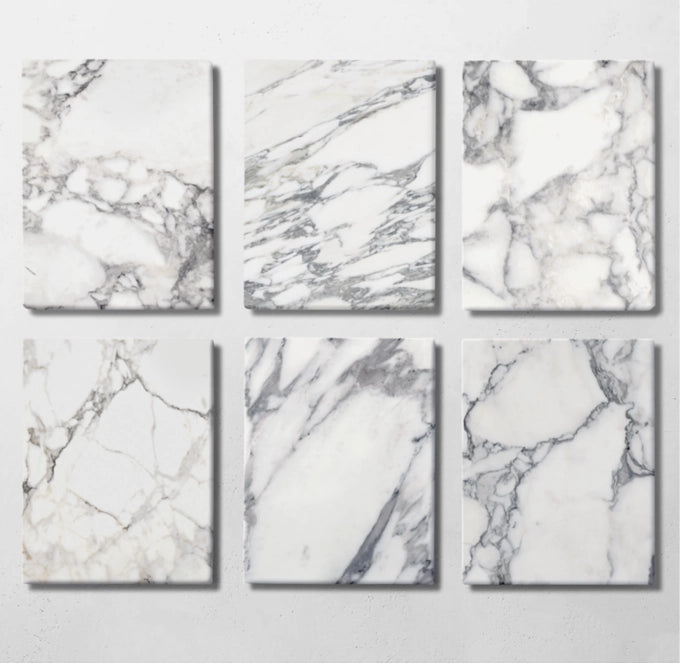 - Italian Arabescato Marble is honed and sealed for a satin finish that highlights the stone's bold vein patterning and striking contrasts