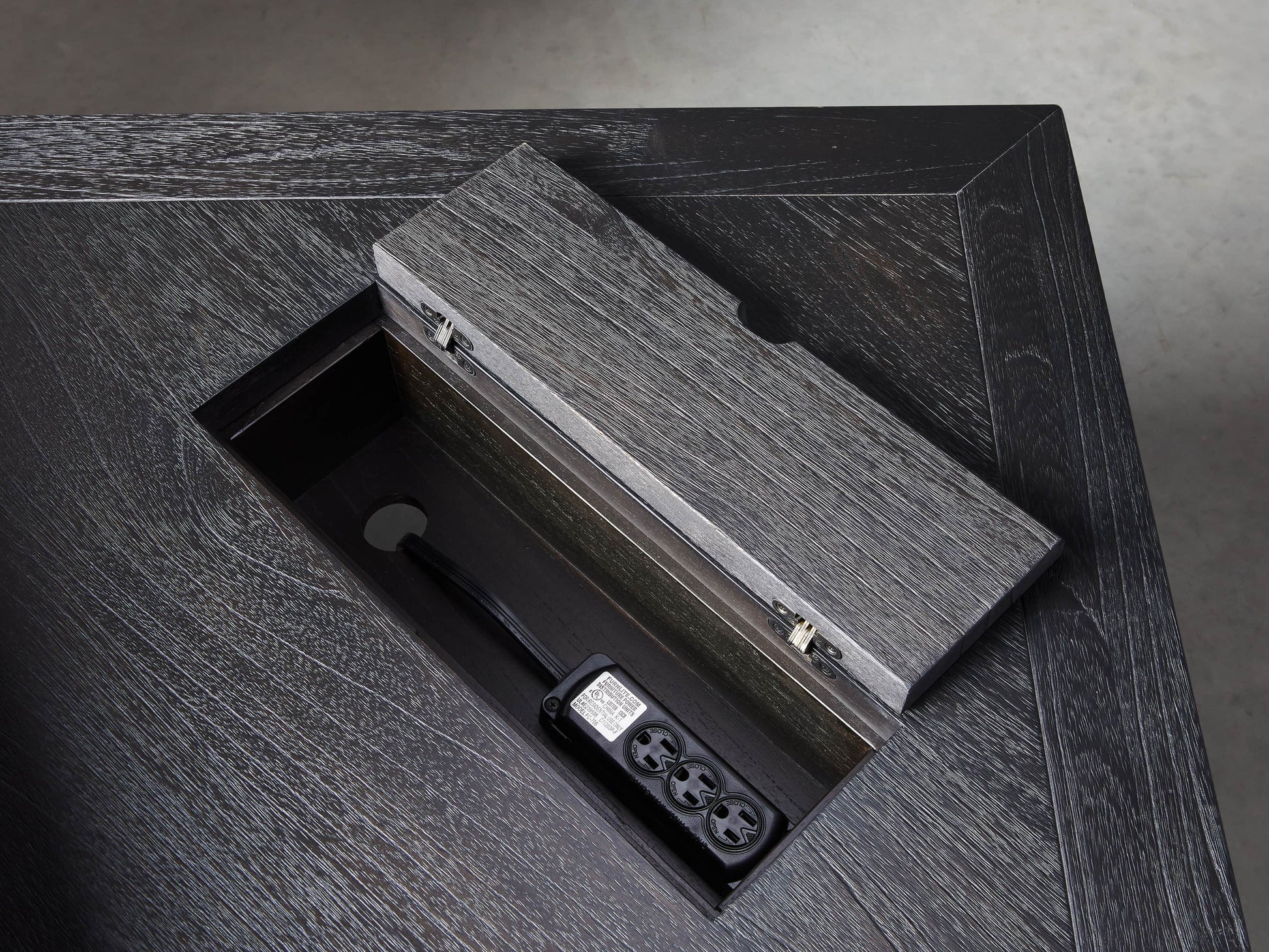 - Top features hidden compartment for office supplies, three-plug media outlet and two removable trays.