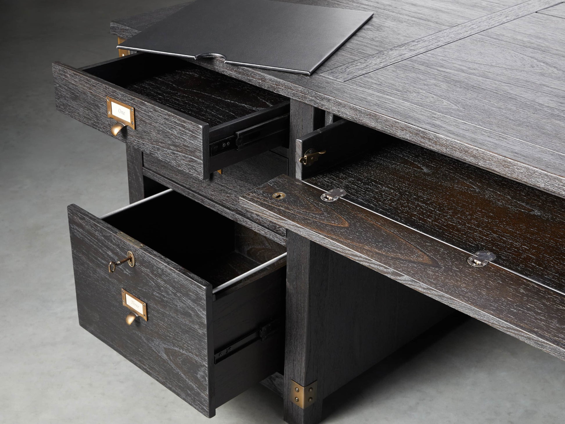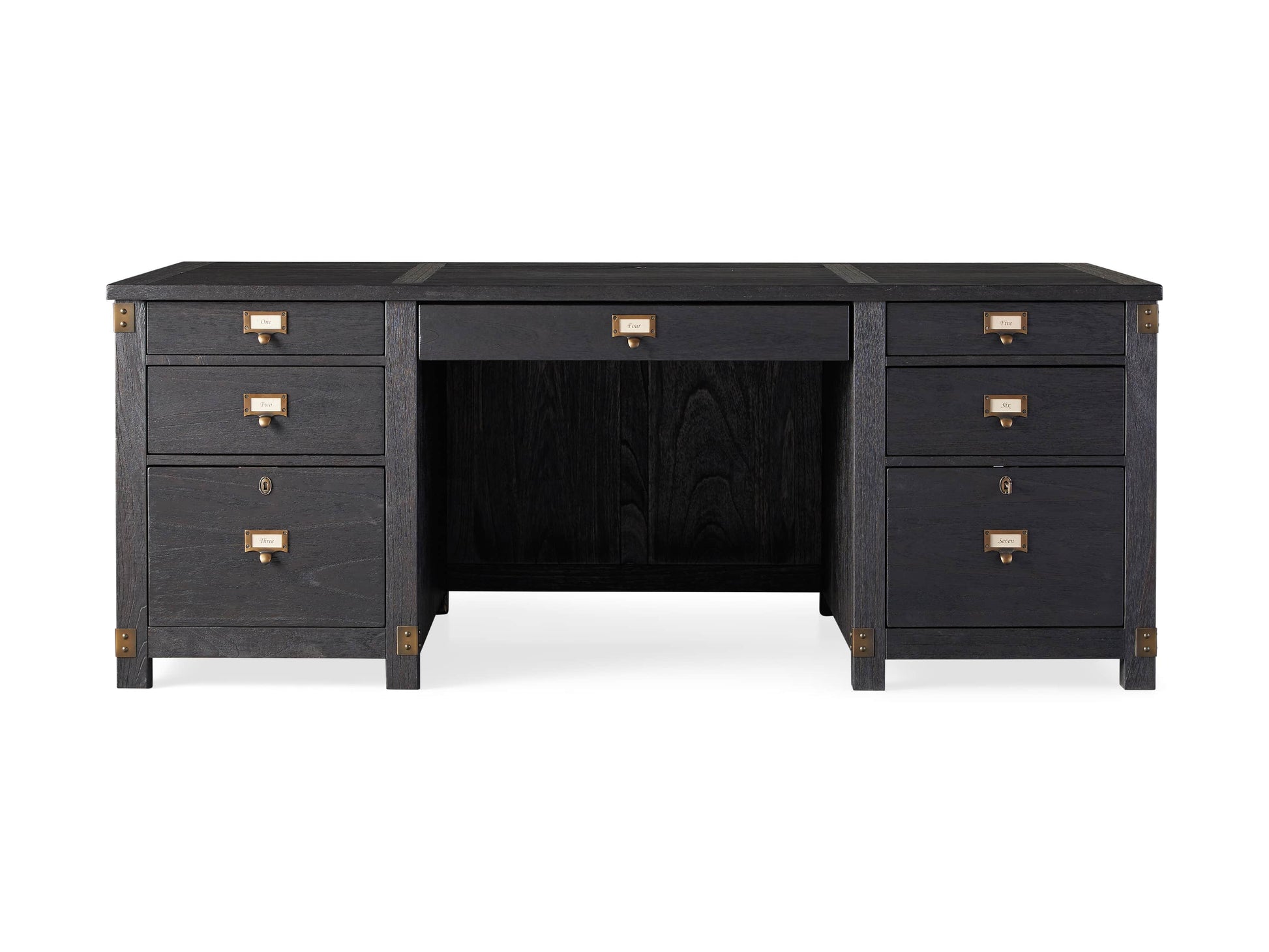 - Warm wood finishes are complemented by solid brass hardware.