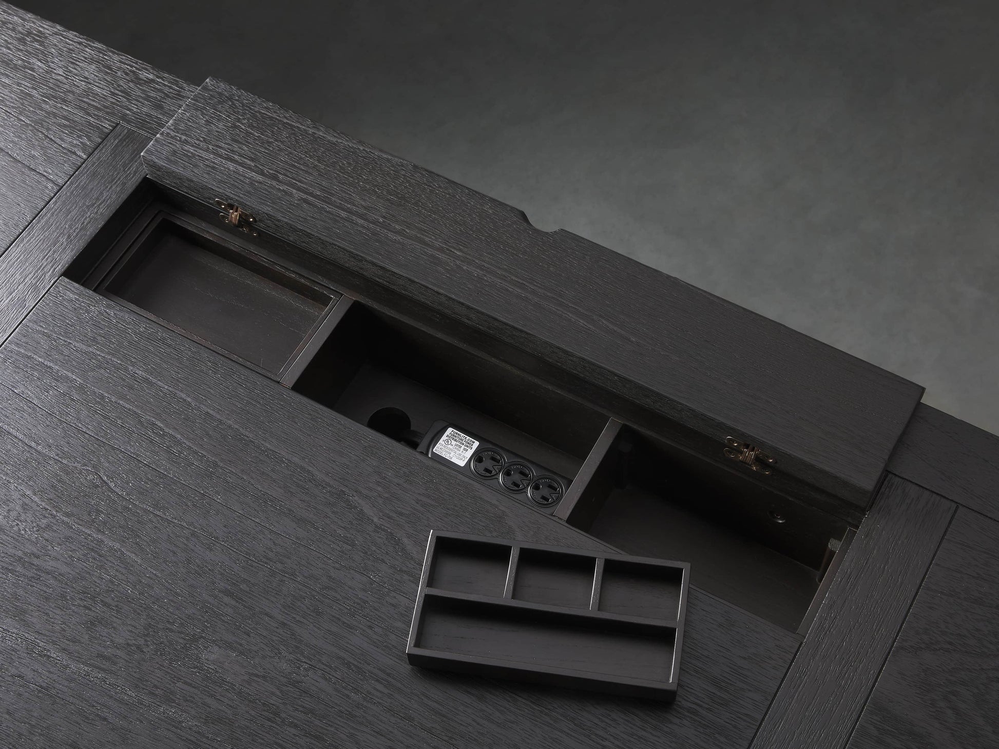 - Top features hidden compartment for office supplies, three-plug media outlet and two removable trays.