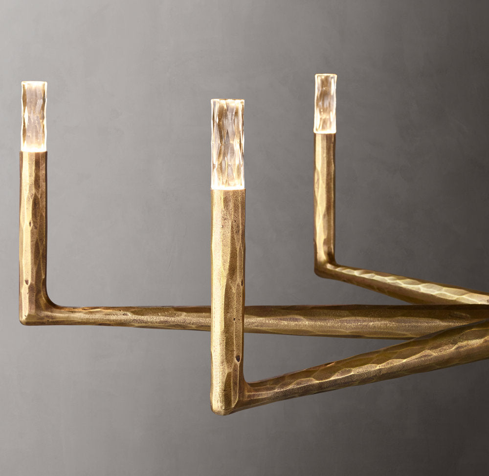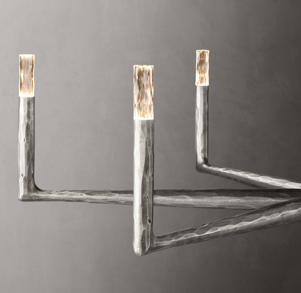 - Faceted, cast glass bulb covers echo the texture of the metal