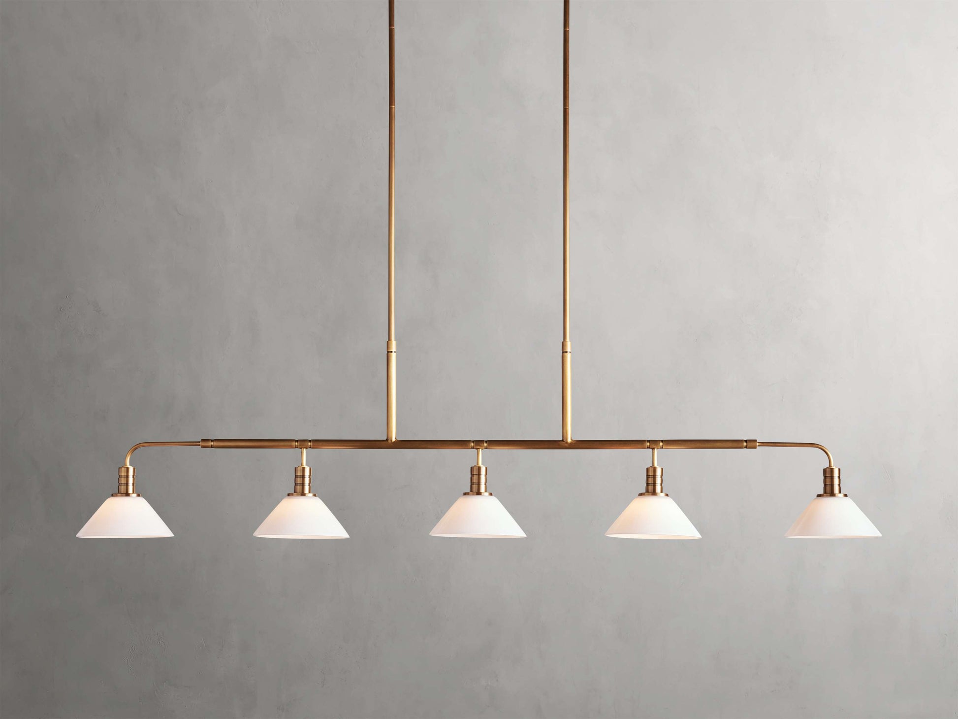 - Crafted from steel in either a brass or bronze finish with your choice of clear or milk glass cones.